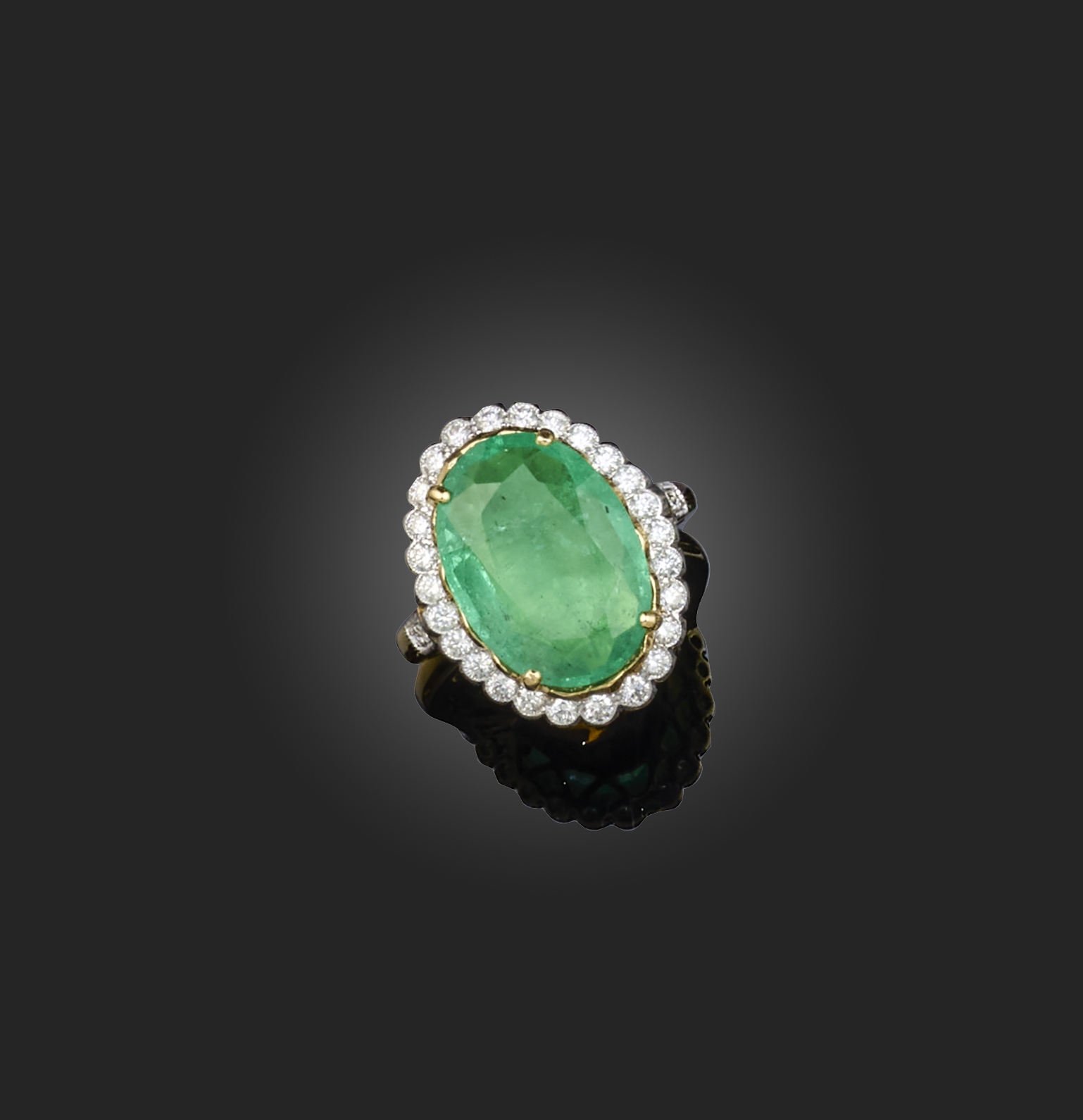 An emerald and diamond ring, of cluster design, claw-set with an oval emerald weighing 6.99 carats, within a border of brilliant-cut diamonds totalling 0.58 carats, mounted in gold, size M1/2, stamped 750