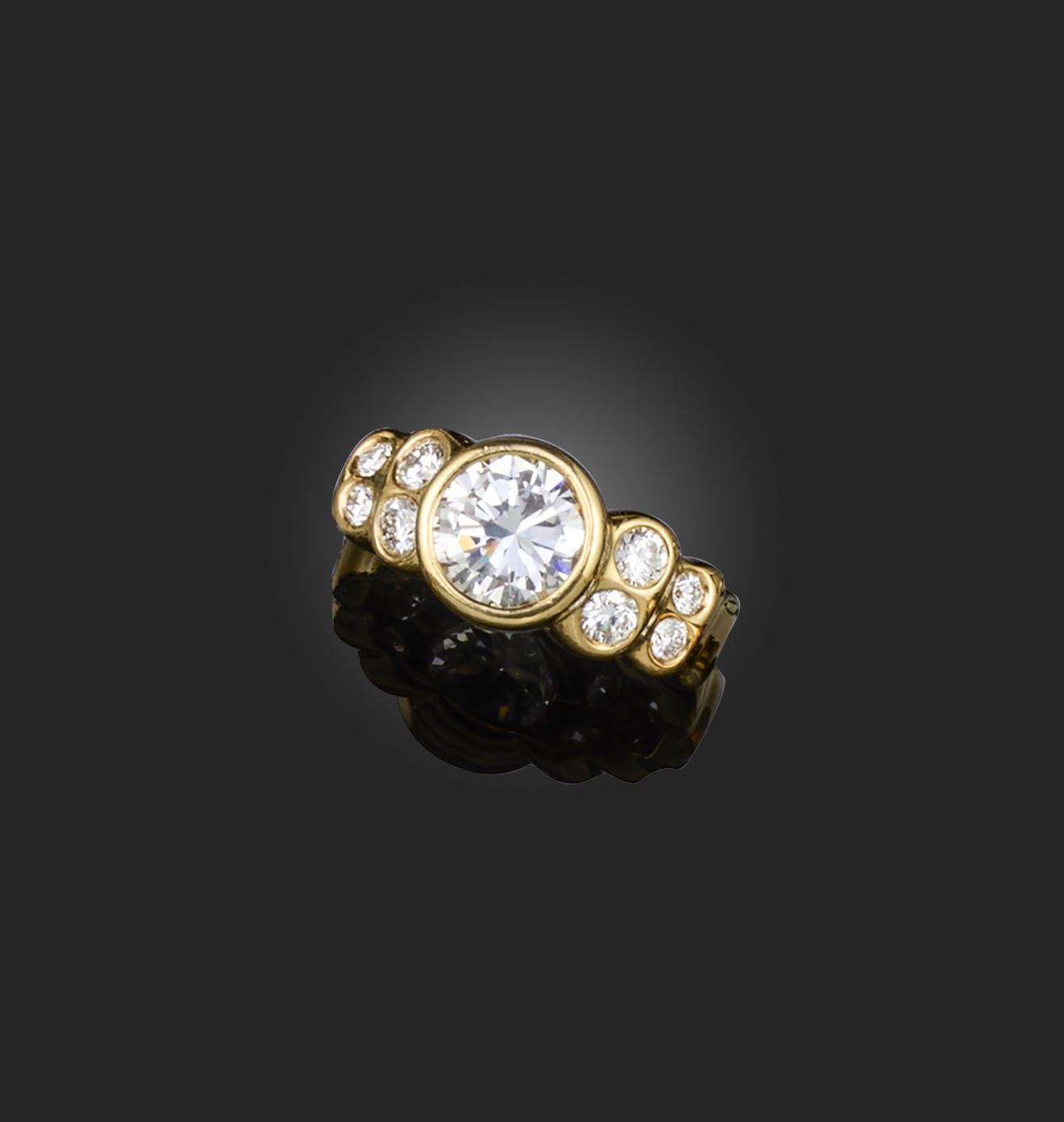 A diamond ring, centring on a collet-set brilliant-cut diamond weighing approximately 1.90 carats, to stepped shoulders collet-set with pairs of smaller brilliant-cut diamonds, mounted in gold, size M1/2, stamped 18K, maker's mark, with original valuation report dated 12th June 1996