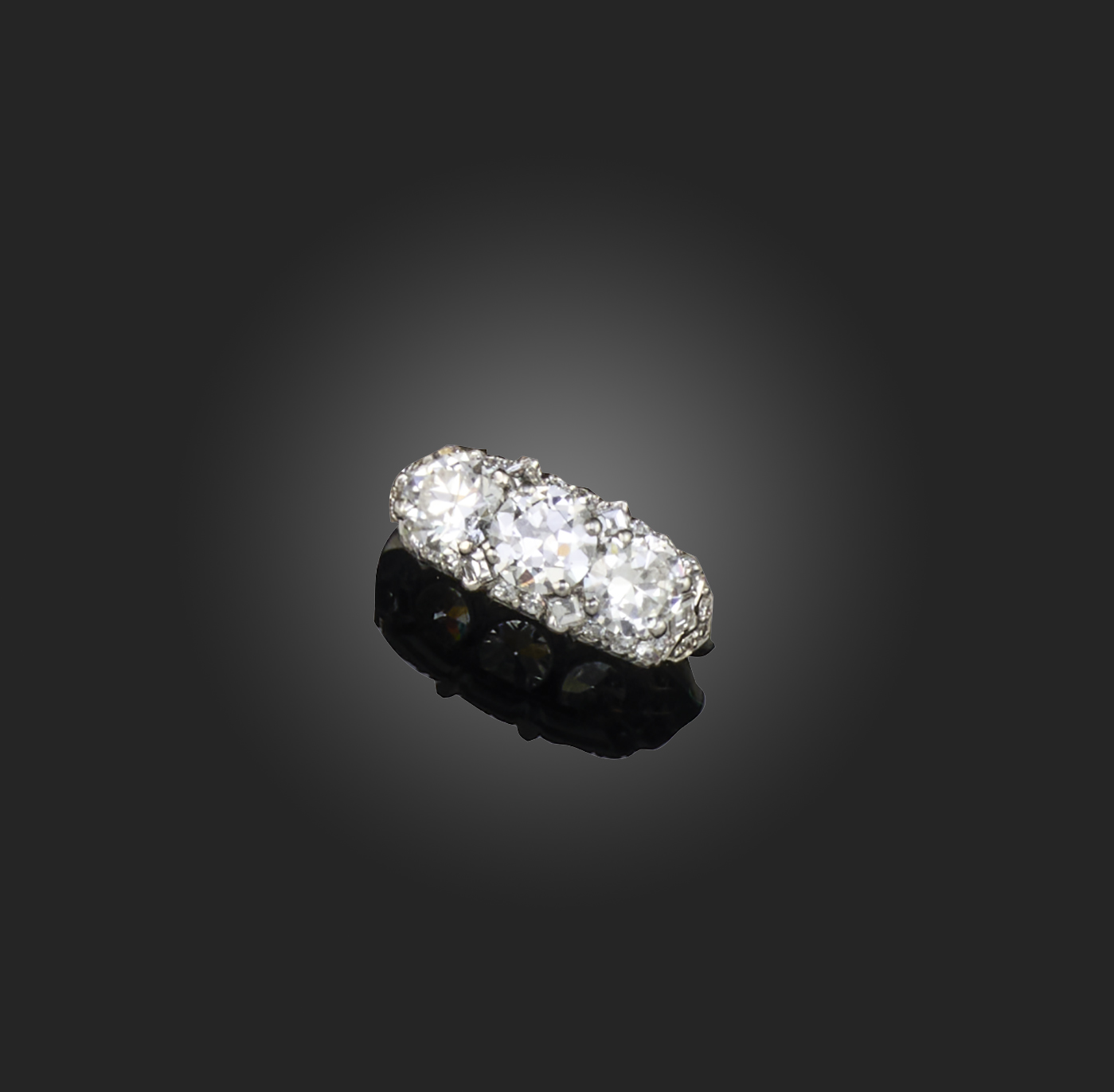 A three-stone diamond ring, claw-set with three circular-cut diamonds totalling approximately 1.70