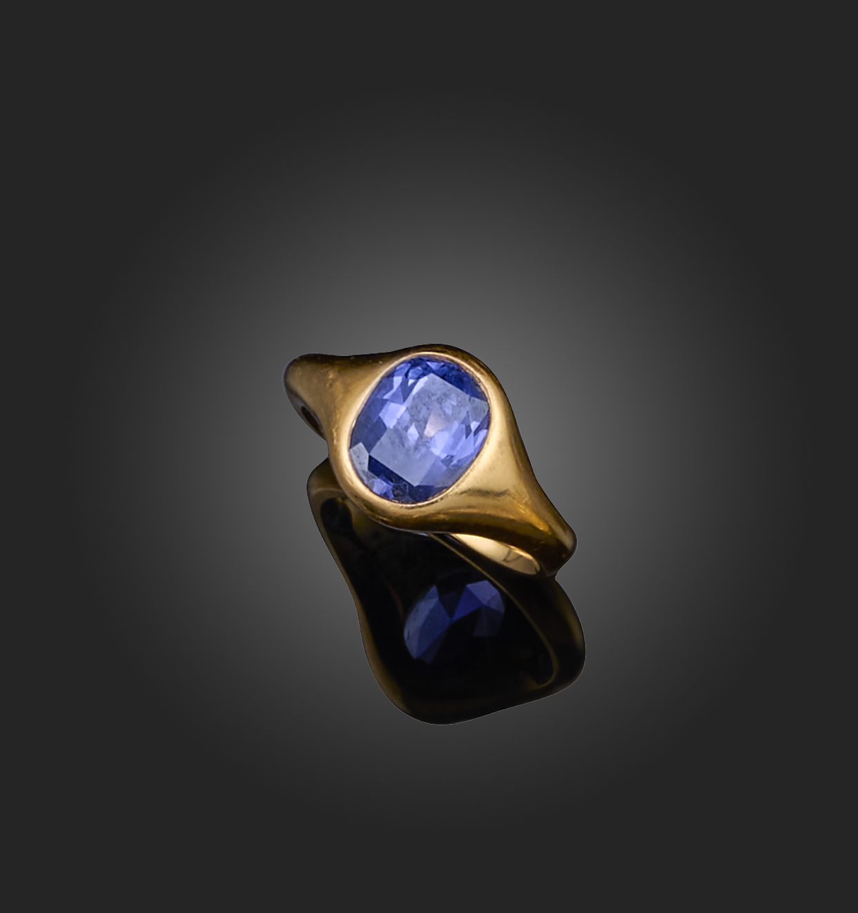 A sapphire solitaire ring, the colour change sapphire weighing 4.03cts in rubover polished yellow