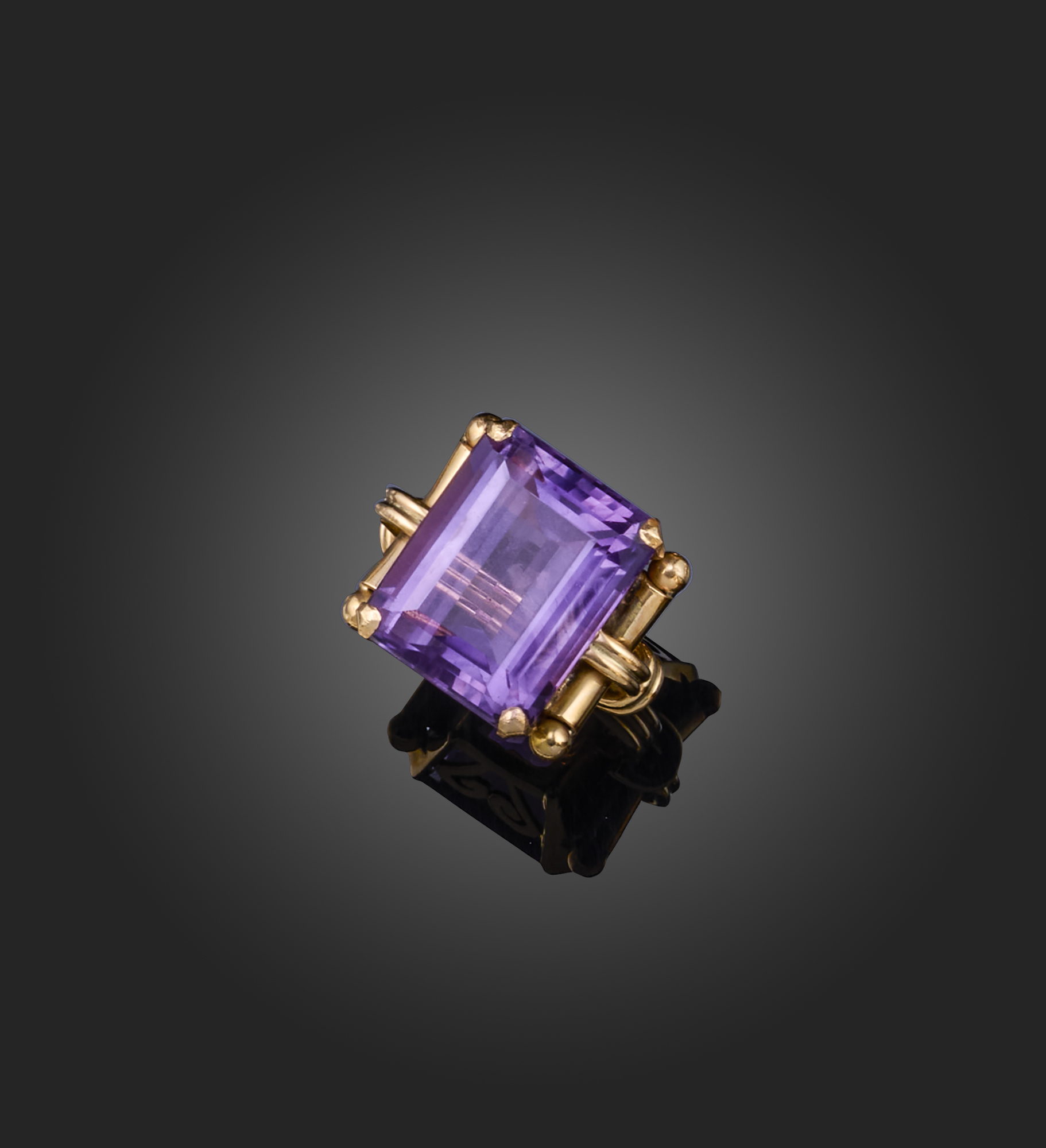An amethyst-set gold ring, the step-cut amethyst set within yellow gold scroll shoulders, size M