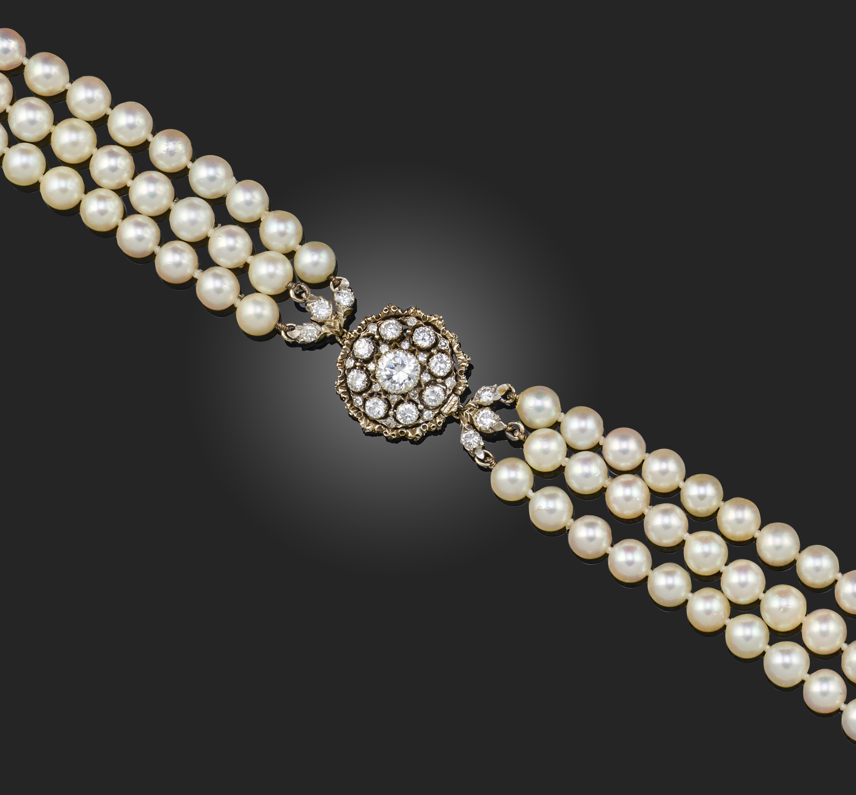 Buccellati, a cultured pearl and diamond necklace, the three rows of pearls graduate from 6 - 9.5mm,