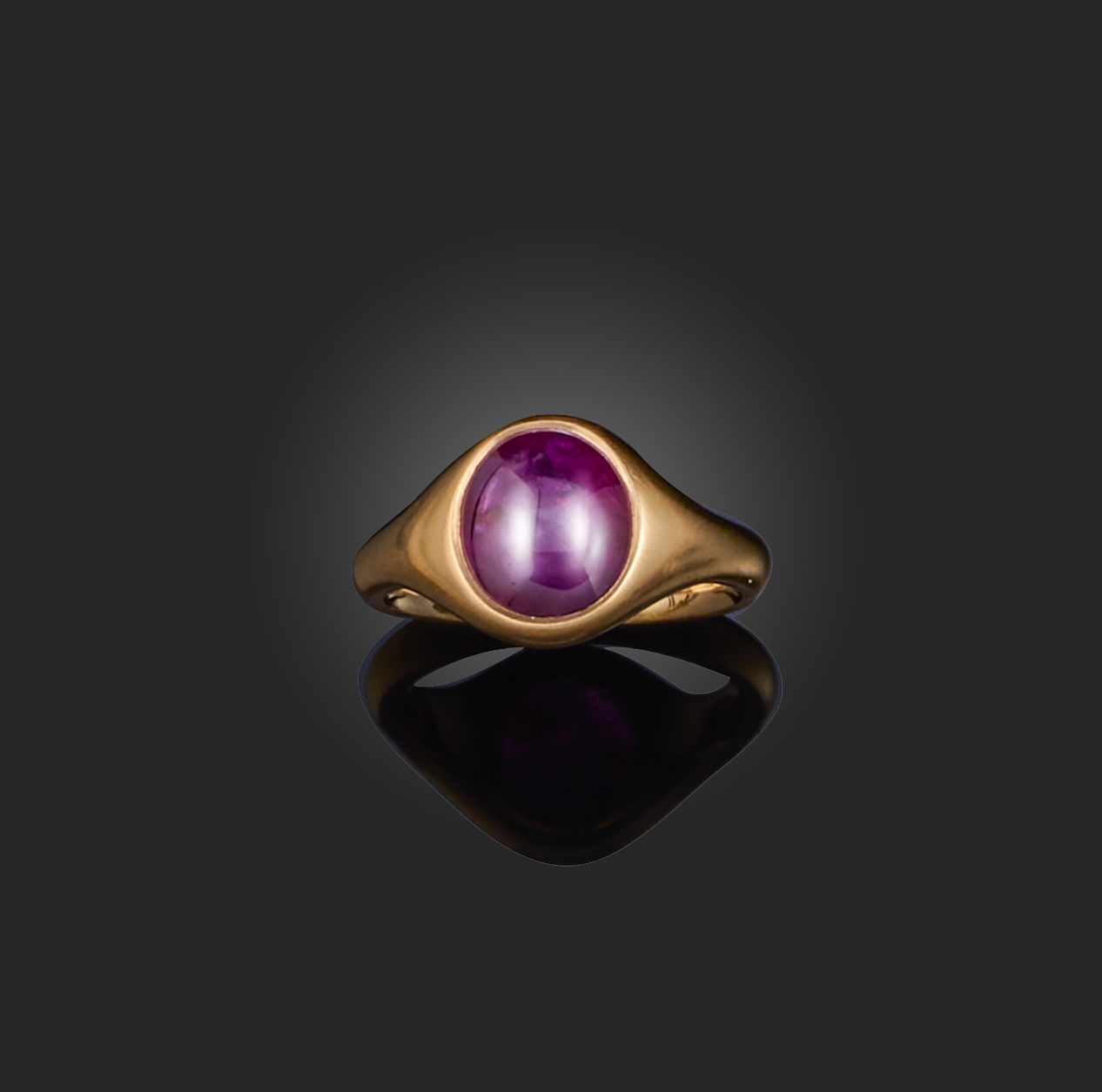 A star ruby solitaire ring, the cabochon star ruby weighing 4.17 carats rubover-set in brushed
