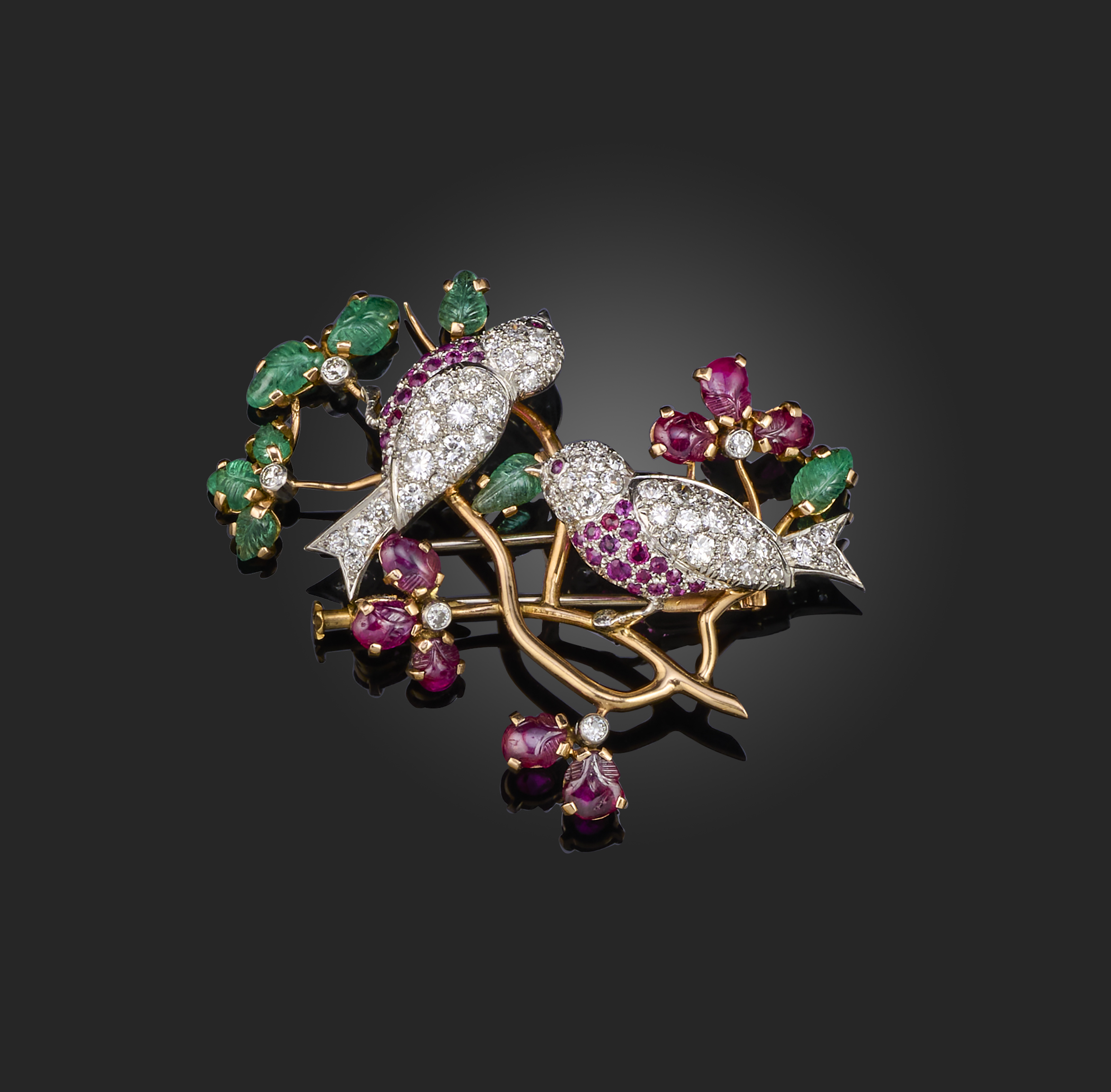 Fontana, a ruby, emerald and diamond brooch, mid 20th century, designed as a pair of songbirds set