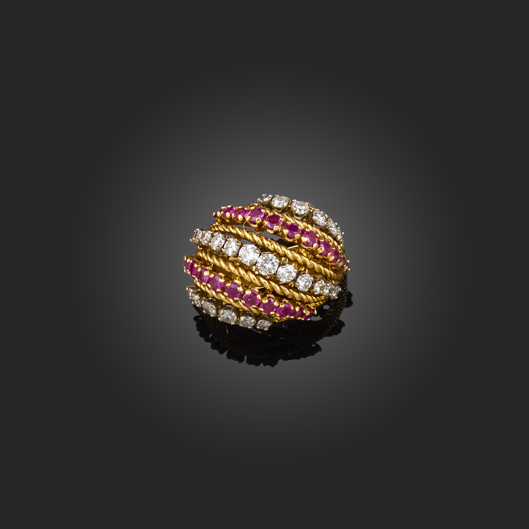 Kutchinsky, a ruby and diamond bombé ring, 1963, diagonally-set with graduated circular-cut rubies and diamonds separated with 18ct yellow gold ropetwists, size L, signed with maker's mark and London hallmarks for 1963