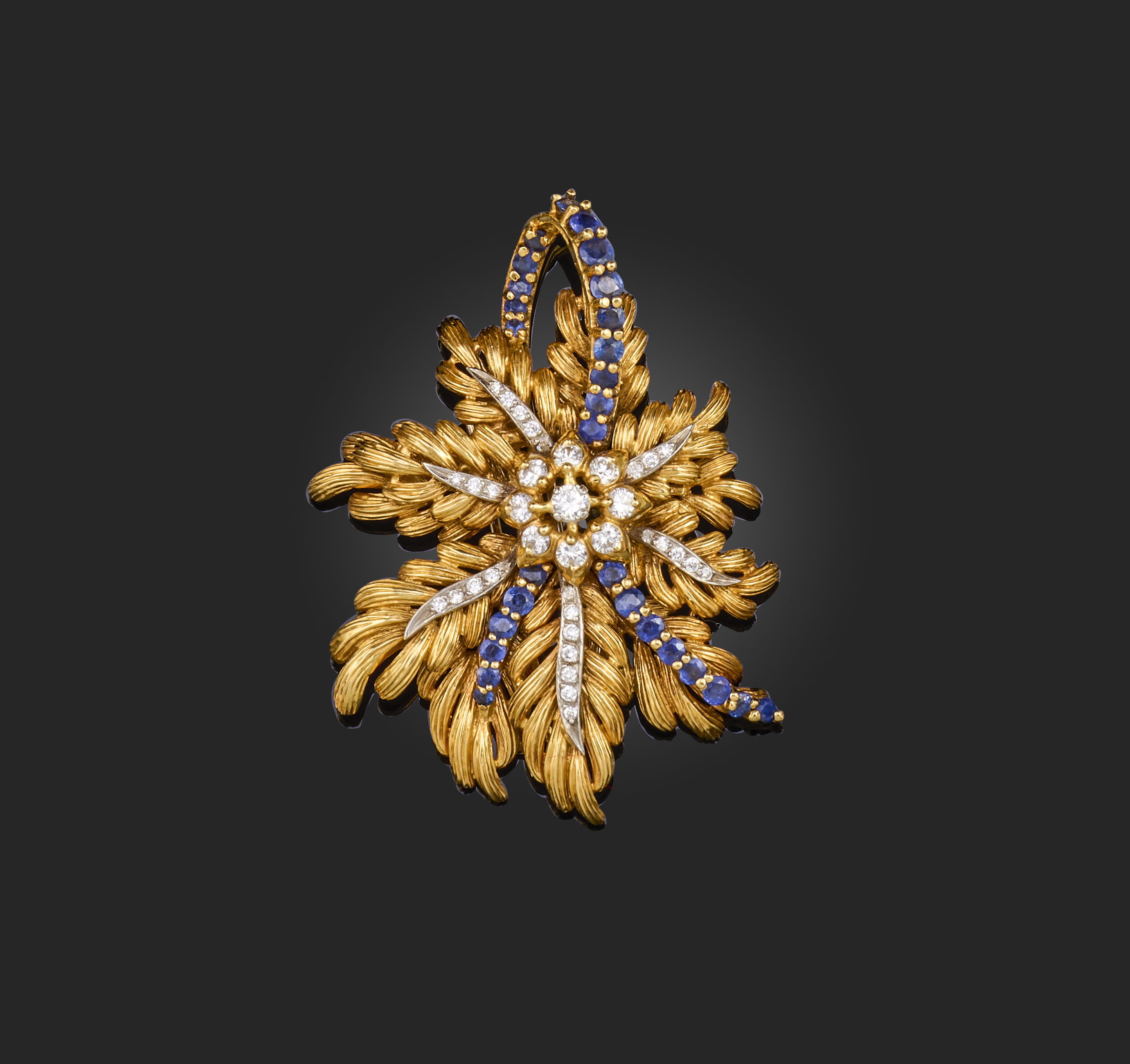 Kutchinsky, a sapphire and diamond brooch, circa 1965, of abstract foliate design, in engraved 18ct