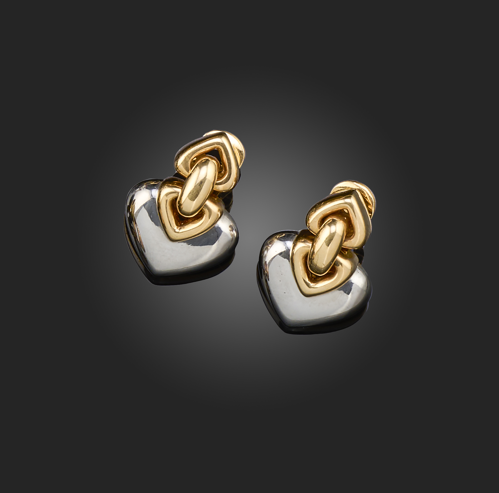 Bulgari, a pair of gold and stainless steel ear clips, 'Doppio Cuore', 1990s, each designed as a