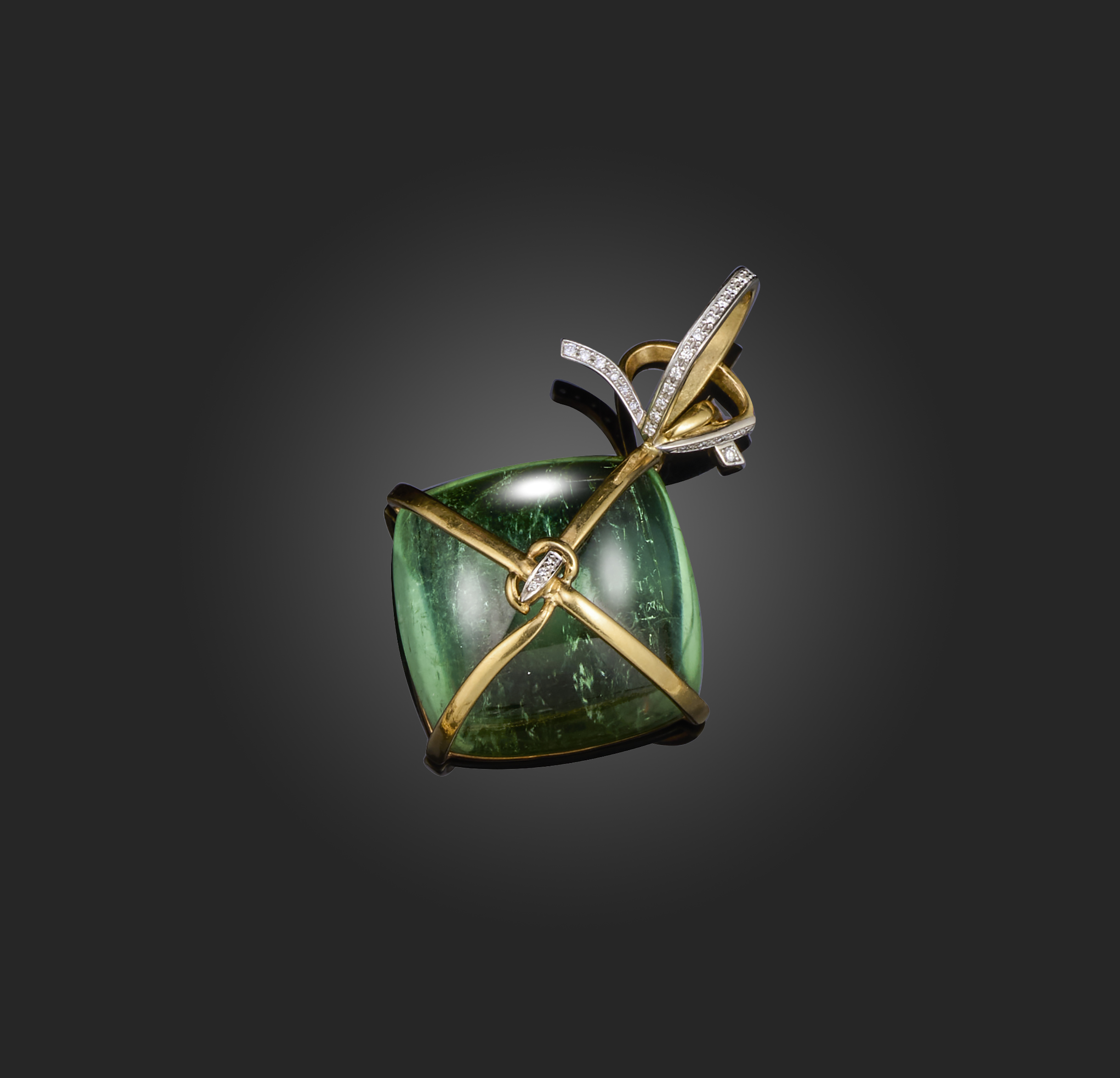 Φ Andrew Grima, a green beryl pendant, designed as a stylised present, the sugarloaf green beryl