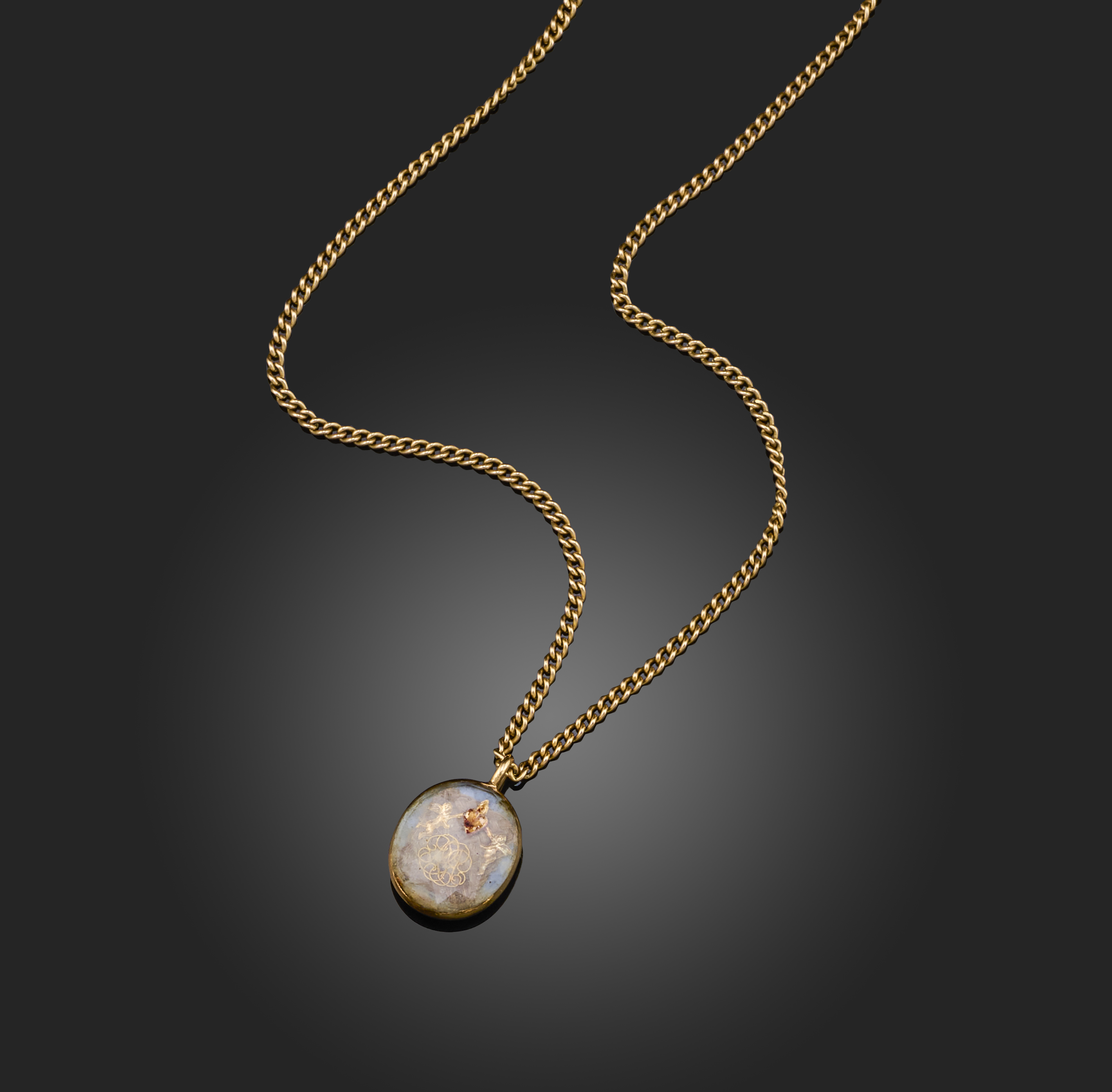 A 'Stuart crystal' mourning pendant, late 17th/early 18th century, the oval pendant depicting two winged cherubs holding a flaming heart, above entwined initials in gold rope twist, on a ground of woven hairwork, beneath a faceted section of rock crystal, mounted in gold, to a later gold curb chain, pendant length 2.0cm, chain length 48cm, chain broken, case stamped SJ Phillips