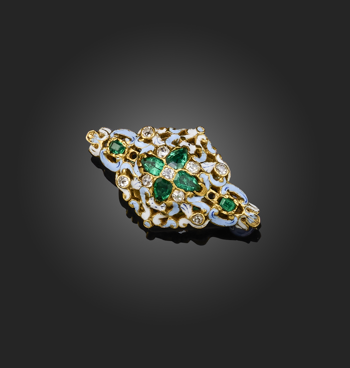 An emerald, enamel and diamond brooch, mid 19th century, designed in the Renaissance revival style,