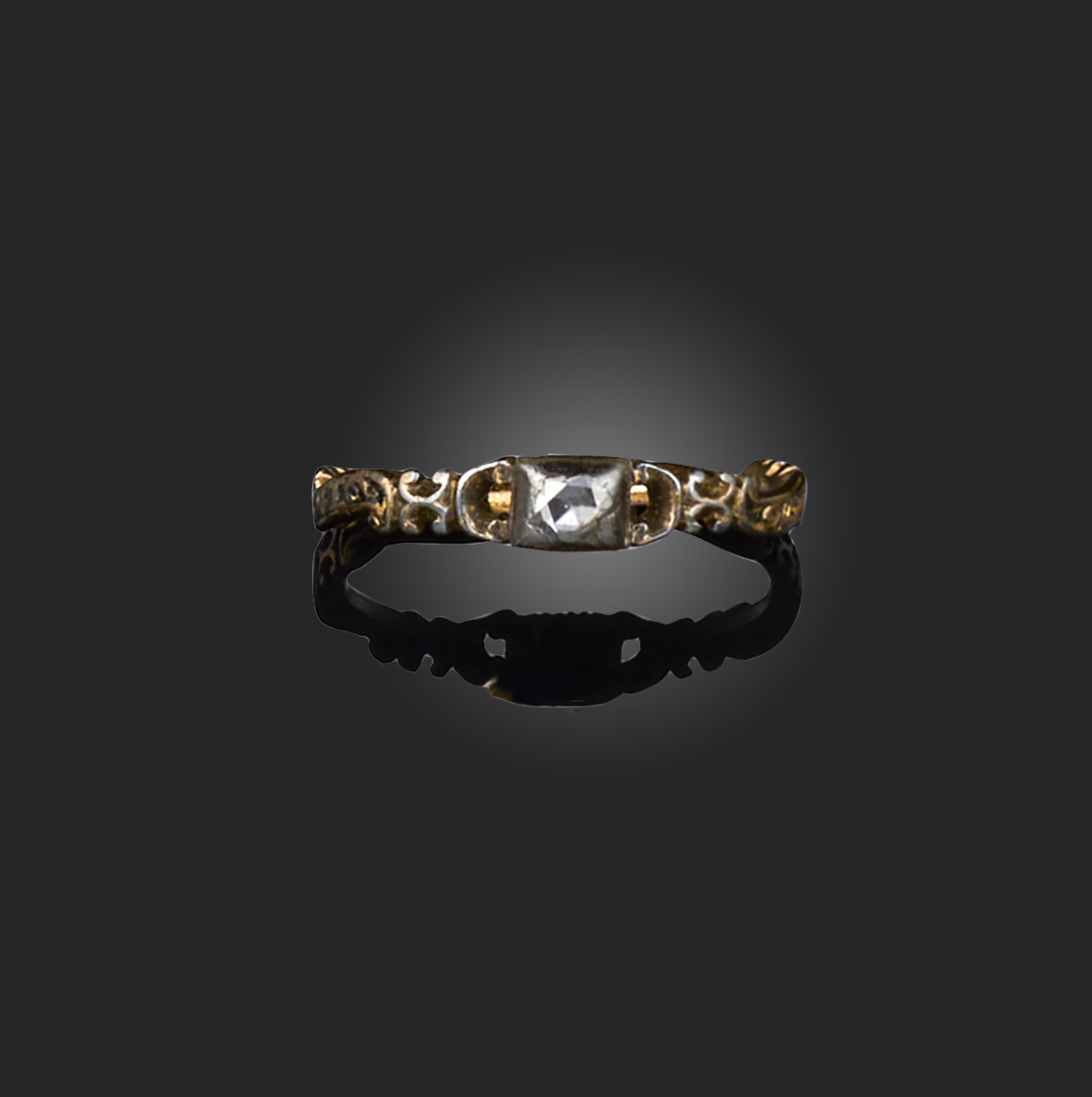 A diamond and enamel mourning ring, circa 1743, centring on a rose-cut diamond in a rectangular