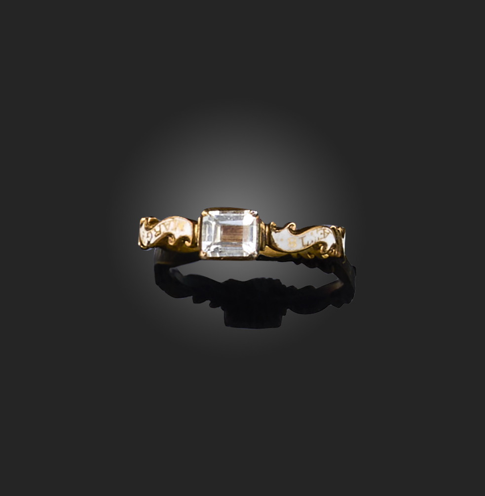 A George II rock crystal and enamel mourning ring, circa 1752, centring on a step-cut rock crystal over hairwork, to a gold band composed of ribbon scrolls applied with white enamel, bearing the inscription 'MARGT GWYNNE OB:13 JULY 1752 AE:18', size H1/2