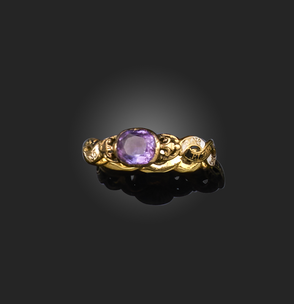 A rare amethyst and enamel double mourning ring, circa 1756, centring on a cushion-shaped amethyst in a closed-back setting, between fleur de lis shoulders, to a band designed as entwined ribbon scrolls applied with black and white enamel, the dedicatory inscriptions 'JNO POWELL OB 6 OCT 1756 AE 35' and 'ELIANOR POWELL OB 27 SEP 1756 AE 66' in reserve, size J1/2