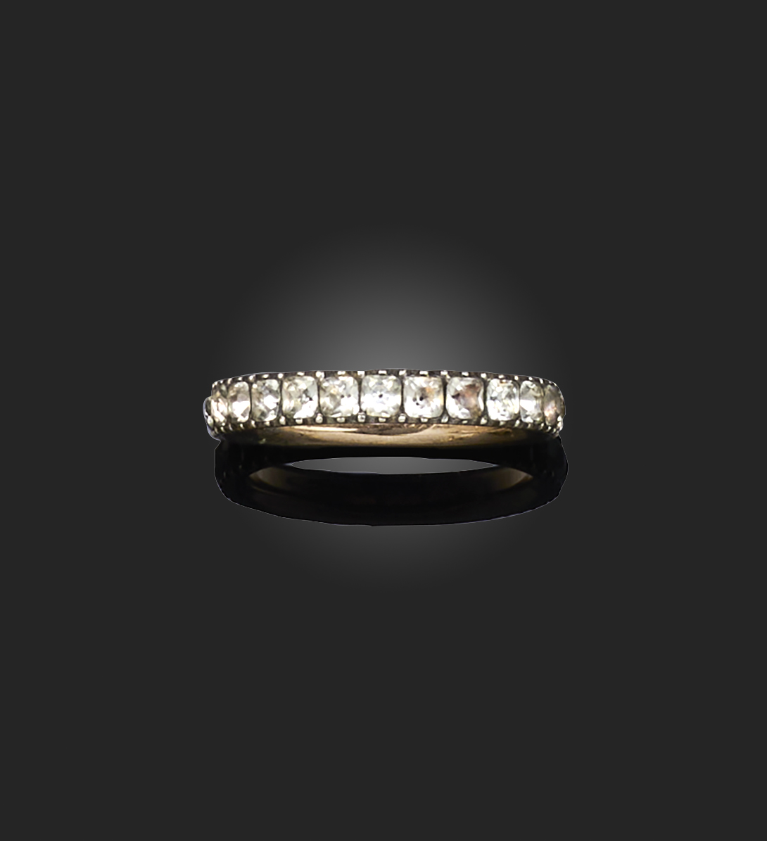 A Georgian paste keeper ring, late 18th century, designed as a continuous band of cushion-shaped pastes, in closed-back settings, mounted in silver and gold, size M1/2