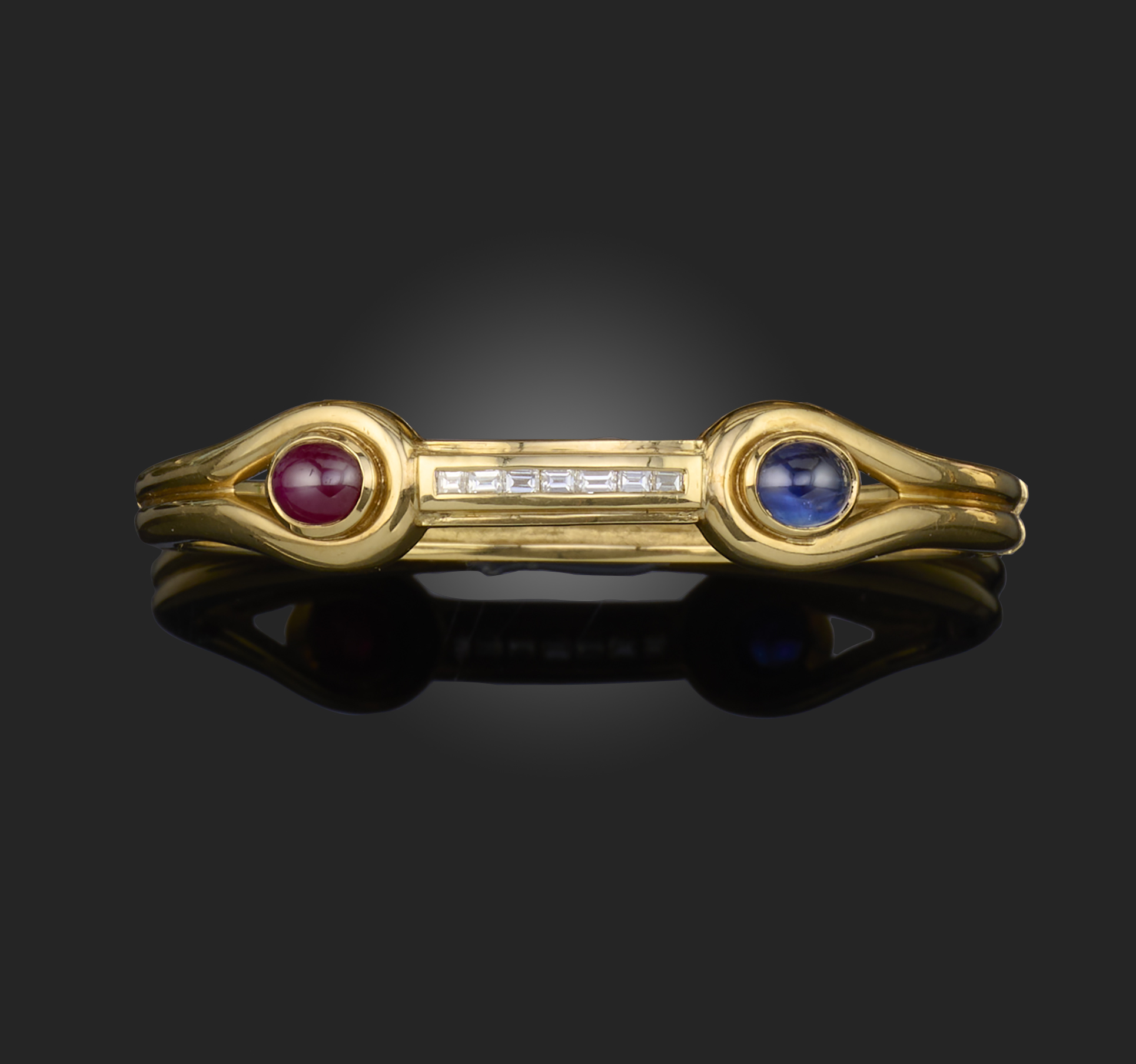A sapphire, ruby and diamond bangle, of hinged construction, the front set with a cabochon ruby and a cabochon sapphire, spaced by a channel-set line of baguette diamonds, mounted in gold, inner circumference 15.7cm, stamped 750, faint Italian maker's mark, gross weight 28 grams