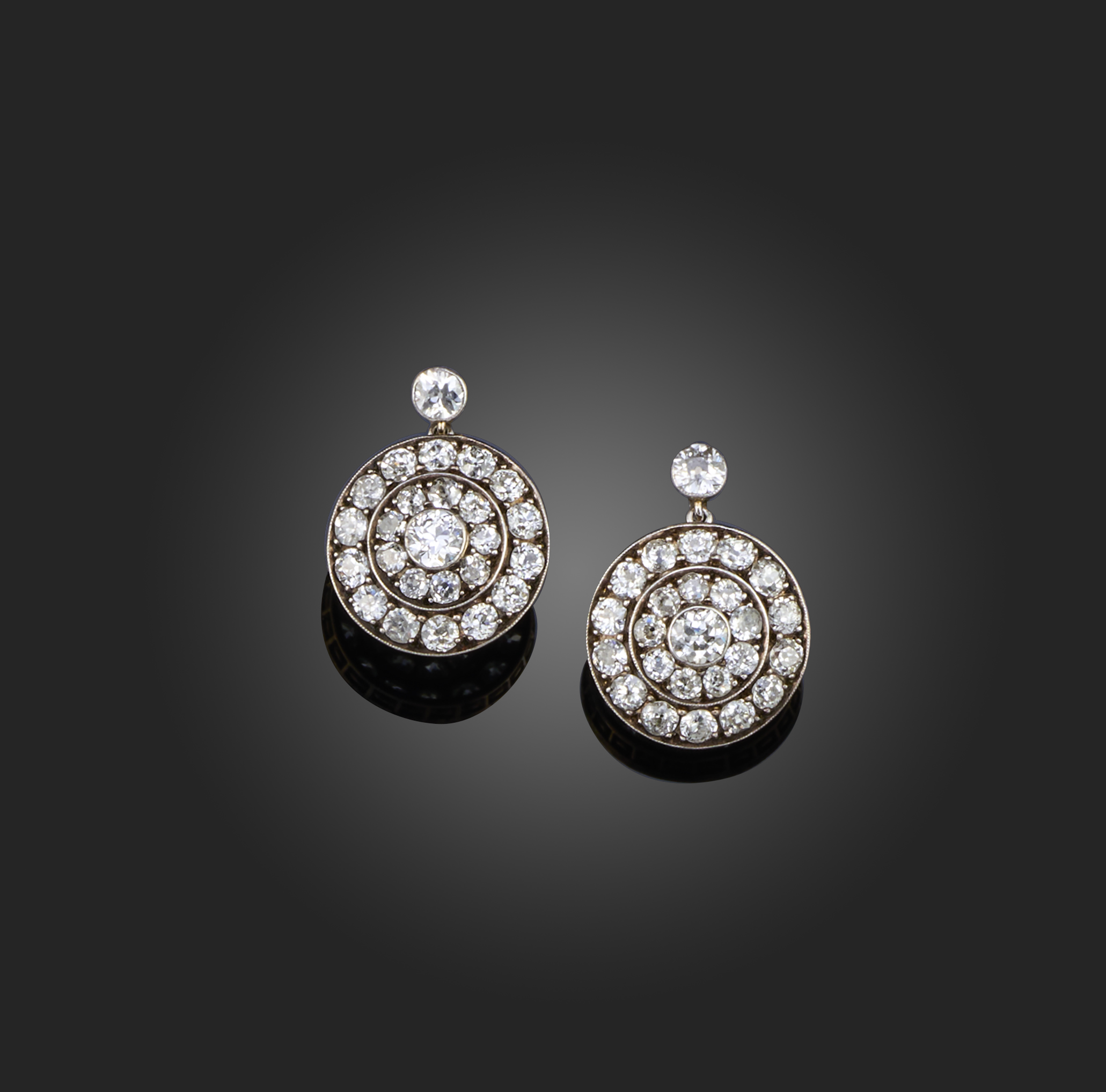 A pair of diamond earrings, Portugal, early 20th century, each designed as a circular cluster set with concentric arrangements of circular-cut and cushion-shaped diamonds, suspended from a collet-set circular-cut diamond, mounted in silver and gold, length 2.4cm each, post fittings, Portuguese assay marks
