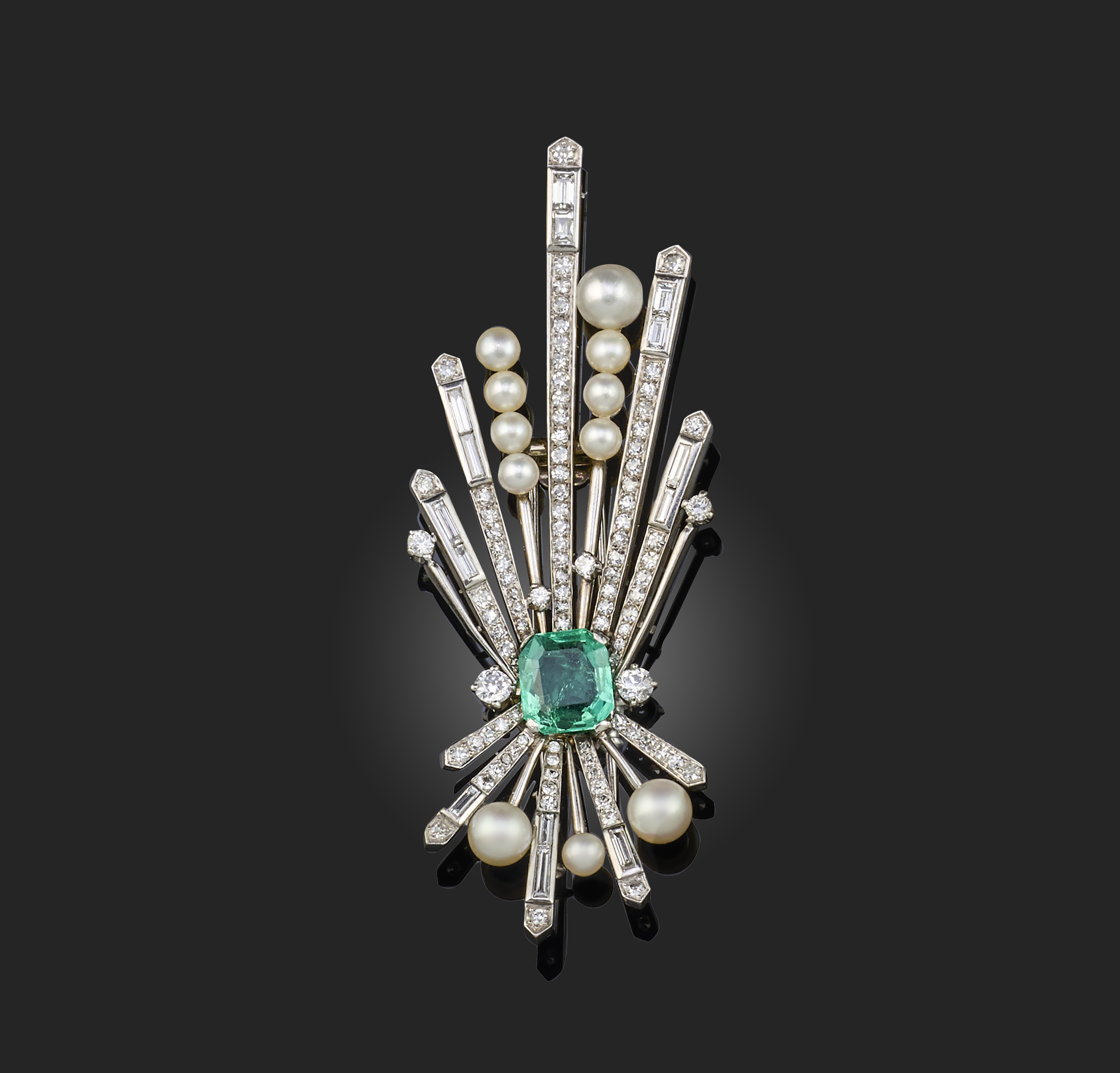 Gübelin, an emerald, natural pearl and diamond brooch, mid 20th century, centring on a step-cut emerald measuring approximately 10.3 x 8.9 x 4.5mm, within a surround designed as an abstract starburst, set with brilliant-cut and baguette diamonds, and pearls, mounted in platinum, length 8.3cm