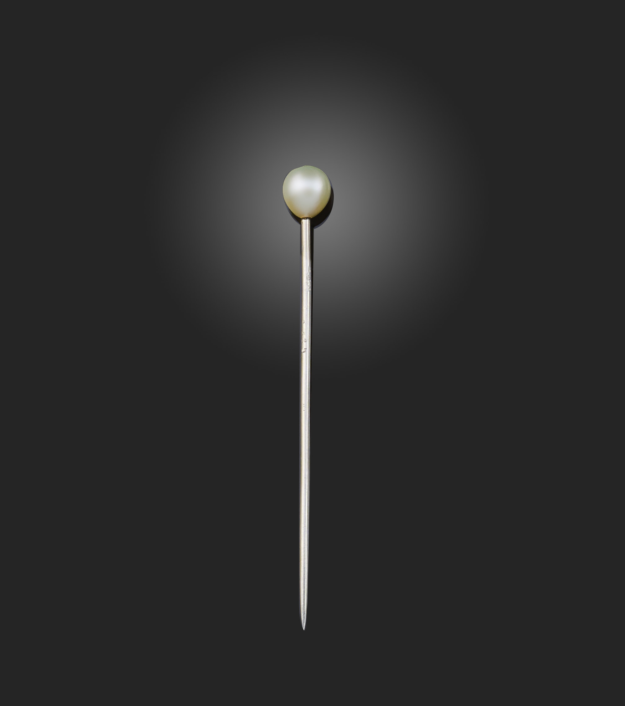 A natural pearl stick pin, early 20th century, set with a pearl measuring 6.5 x 6.5 x 7.4mm, to a