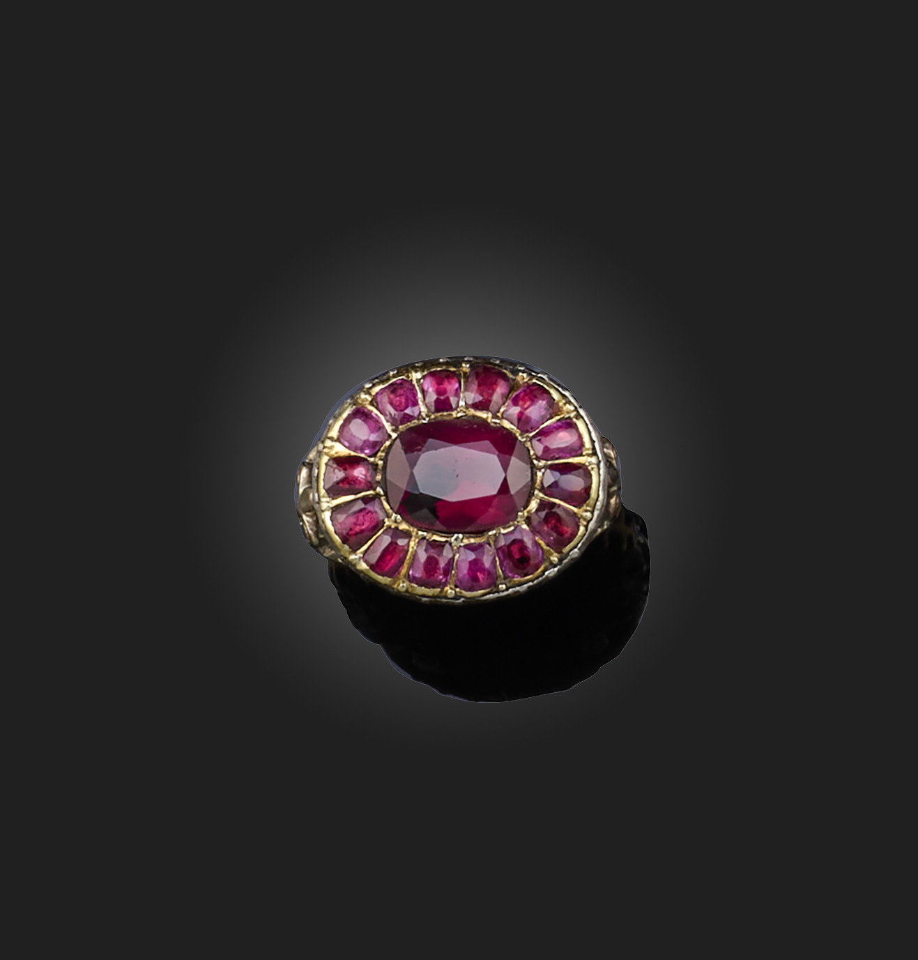 A gem-set cluster ring, set with a central red tourmaline within a surround of cushion-shaped rubies
