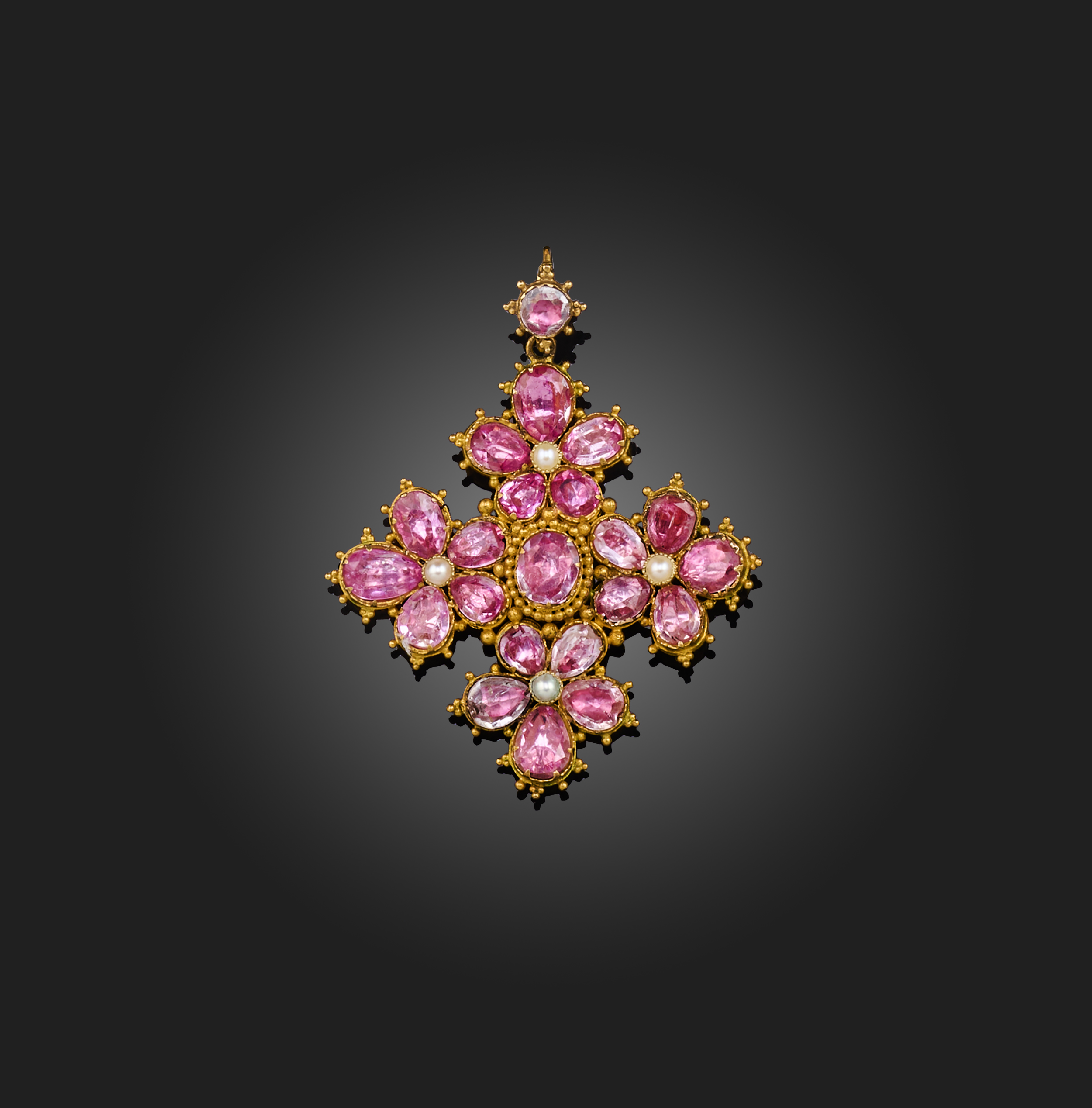 A rock crystal and seed pearl mourning brooch/pendant, 1830s, designed as a floral cross, set with oval and pear-shaped rock crystal in pink foiled settings, accented by seed pearls, mounted in gold with beaded borders, to a similar rock crystal bail, the reverse with a glazed compartment containing hairwork, length 5.5cm, pin deficient, pearls untested