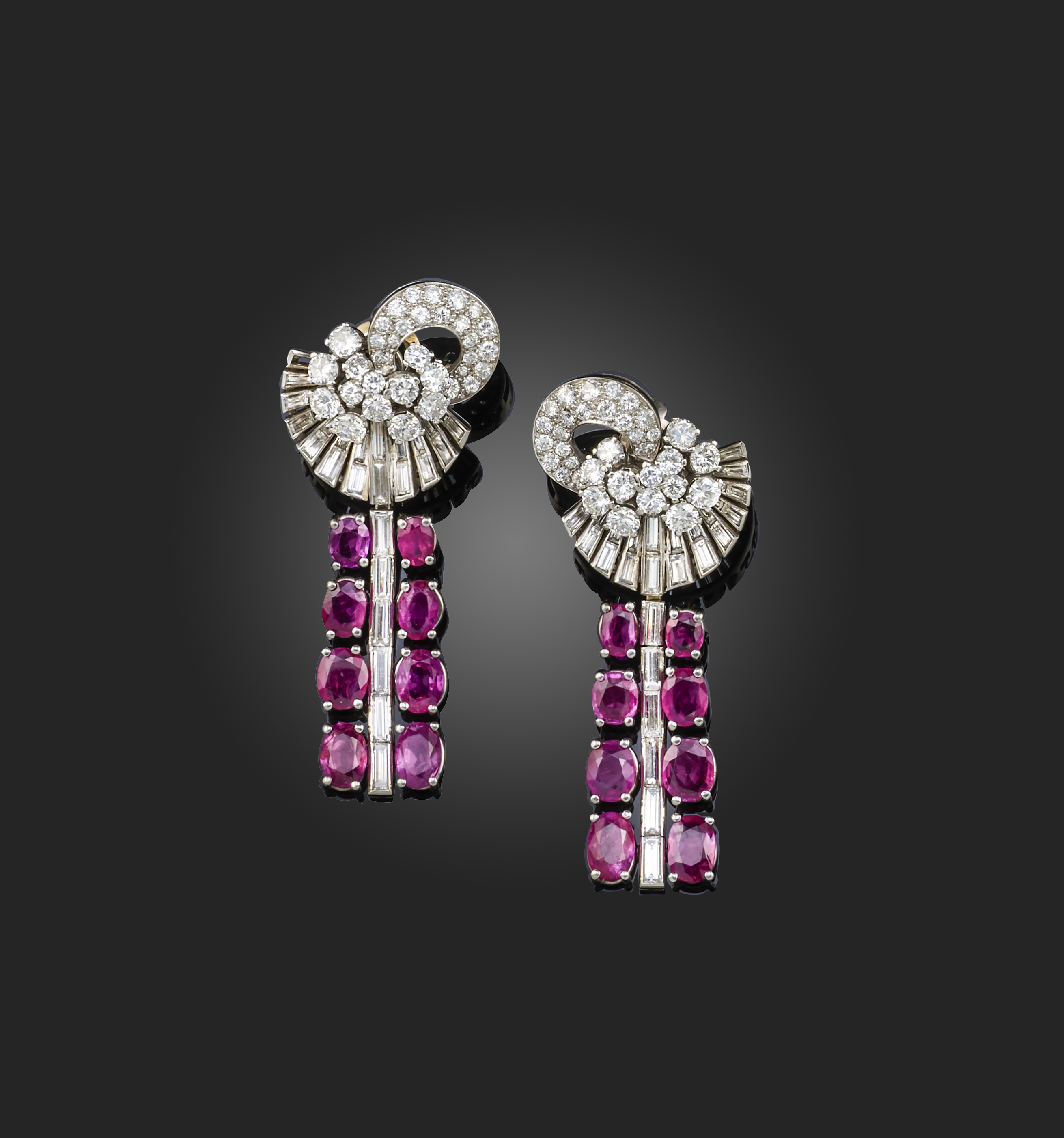 A pair of ruby and diamond earrings, mid 20th century, of 'day and night' design, composed of a scrolled earring set with brilliant-cut and baguette diamonds, suspending an articulated drop set with baguette diamonds and oval rubies, mounted in platinum, total length 5.6cm each, clip and post fittings