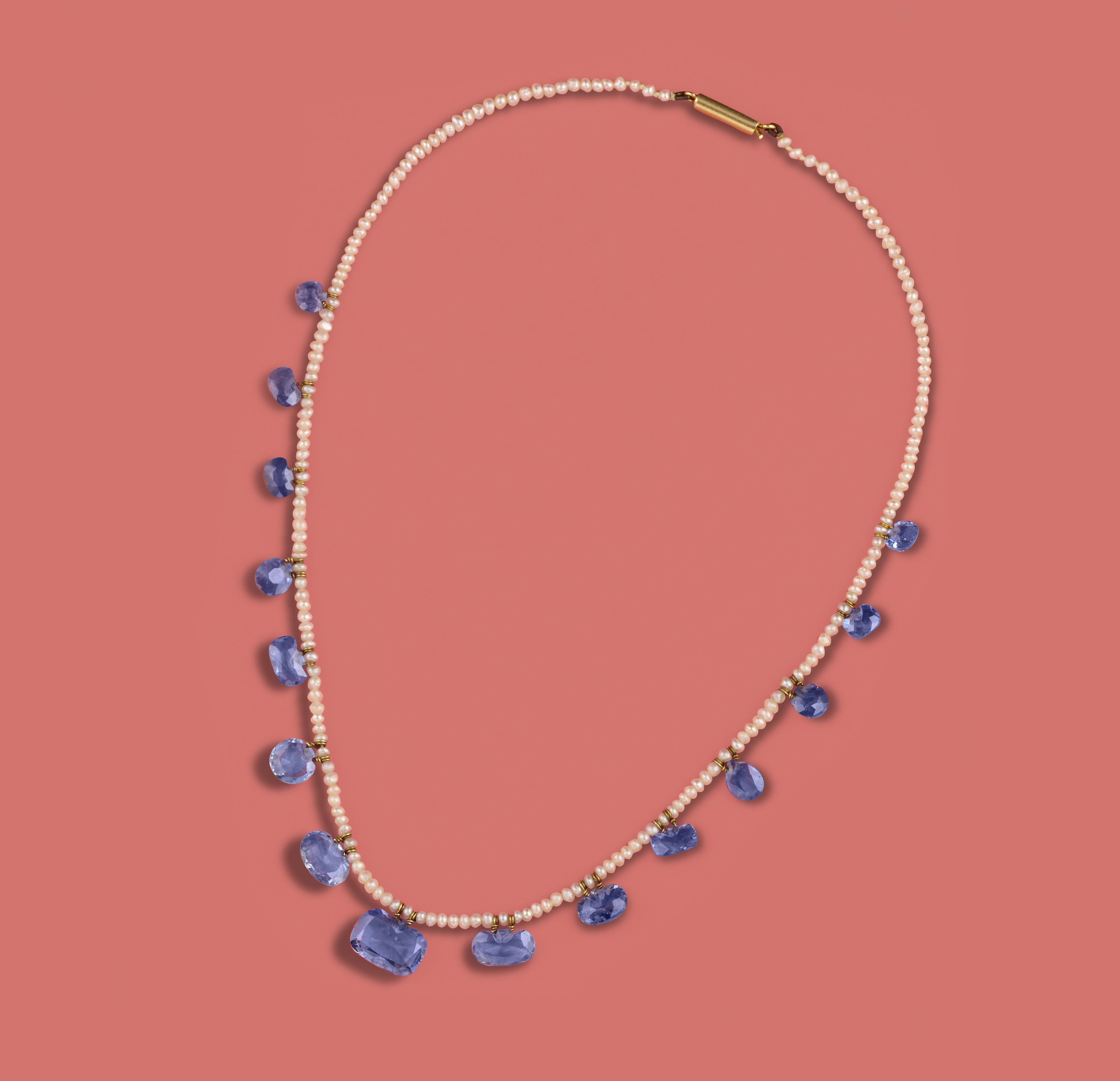 A seed pearl and sapphire necklace, India, late 19th/early 20th century, designed as a strand of