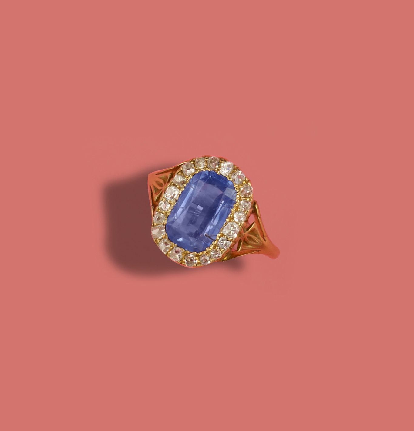 A late 19th century sapphire and diamond cluster ring, the step-cut sapphire weighing 4.42cts, set within a surround of cushion-shaped diamonds in carved and pierced yellow gold setting, size Q