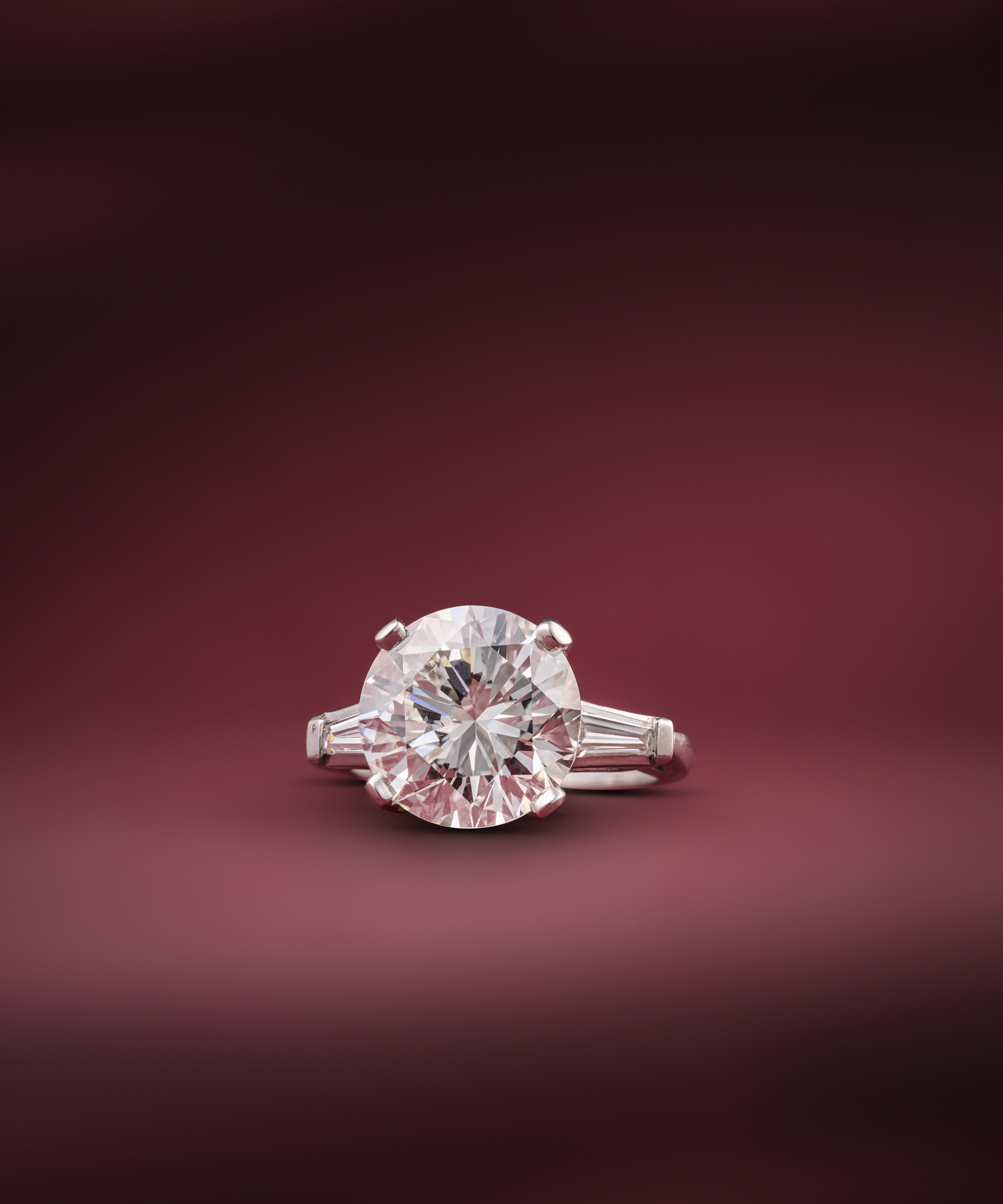An impressive diamond ring, claw-set with a brilliant-cut diamond weighing 5.06 carats, between shoulders mounted with tapered baguette diamonds, mounted in platinum, size J1/2, stamped PLAT