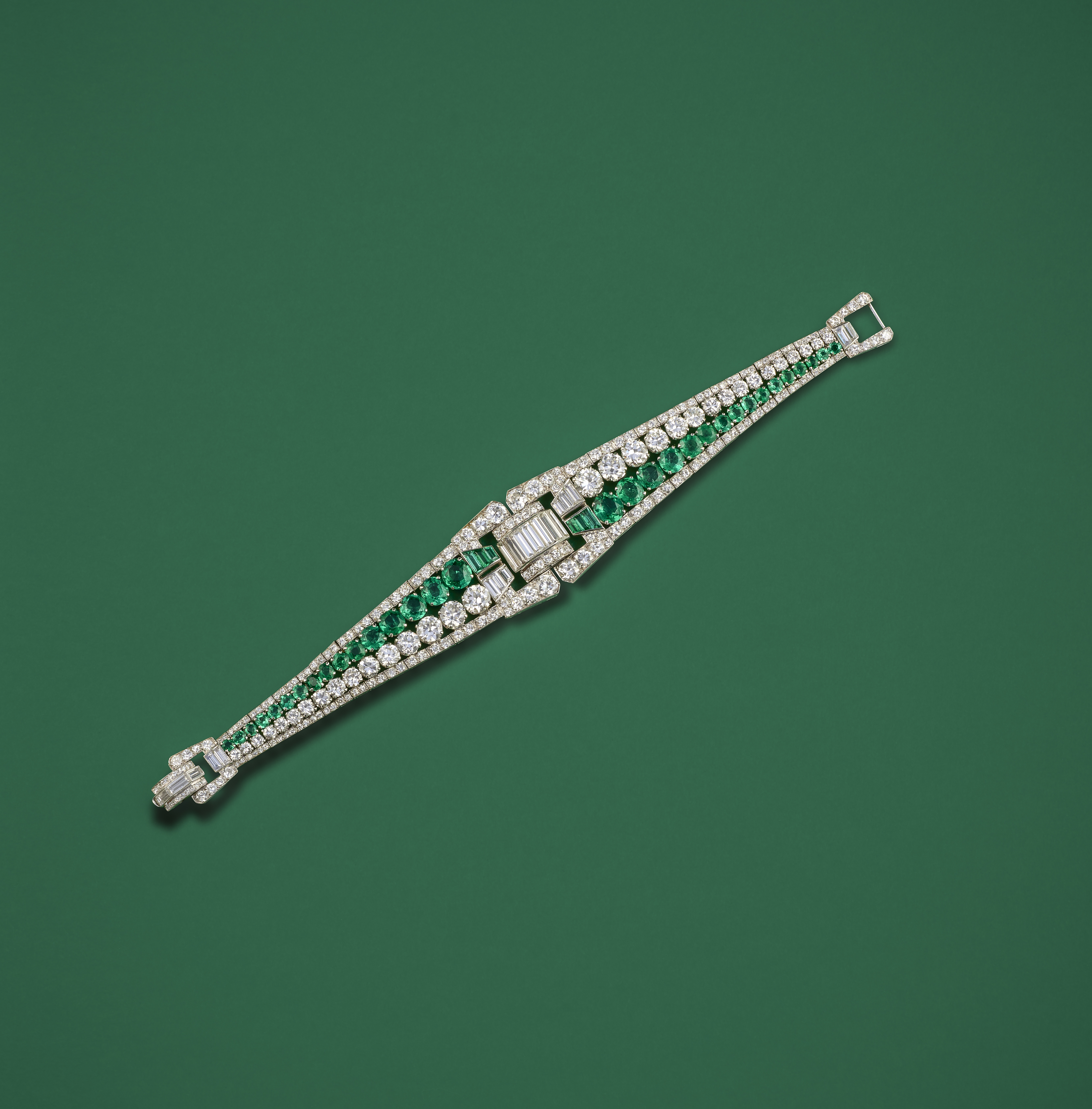 Drayson were a London-based family firm, and one of a very limited number of London jewellers whose Art Deco jewels truly rivalled the quality and style of their French competitors. Founded in 1936 by Keith Cecil Drayson as Cecil Drayson Ltd., the family was already deeply involved with the jewellery trade, and had been prominent dealers of antique jewellery and gemstones since the opening years of the 20th century. While Drayson jewels are rarely seen in general, the striking geometric design of this bracelet, with its array of sparkling circular and baguette diamonds dramatically crossed through by a line of deep green emeralds, appears to have been a favourite of the company's designers in the late 1930s, with a small group of other examples known, predominantly set with rubies and sapphires. The present bracelet however, is particularly lavish, with large circular-cut emeralds and diamonds taking the place of the channel-set calibré-cut stones more commonly used in these extraordinary bracelets. While Drayson's jewels are memorably stylish and beautifully made, the company's heyday was relatively brief - the firm did not outlive its founder, and was purchased by rivals SJ Rood after Drayson's death in 1963, marking the end of this illustrious London jeweller, whose designs rank among the best of British Art Deco jewels.