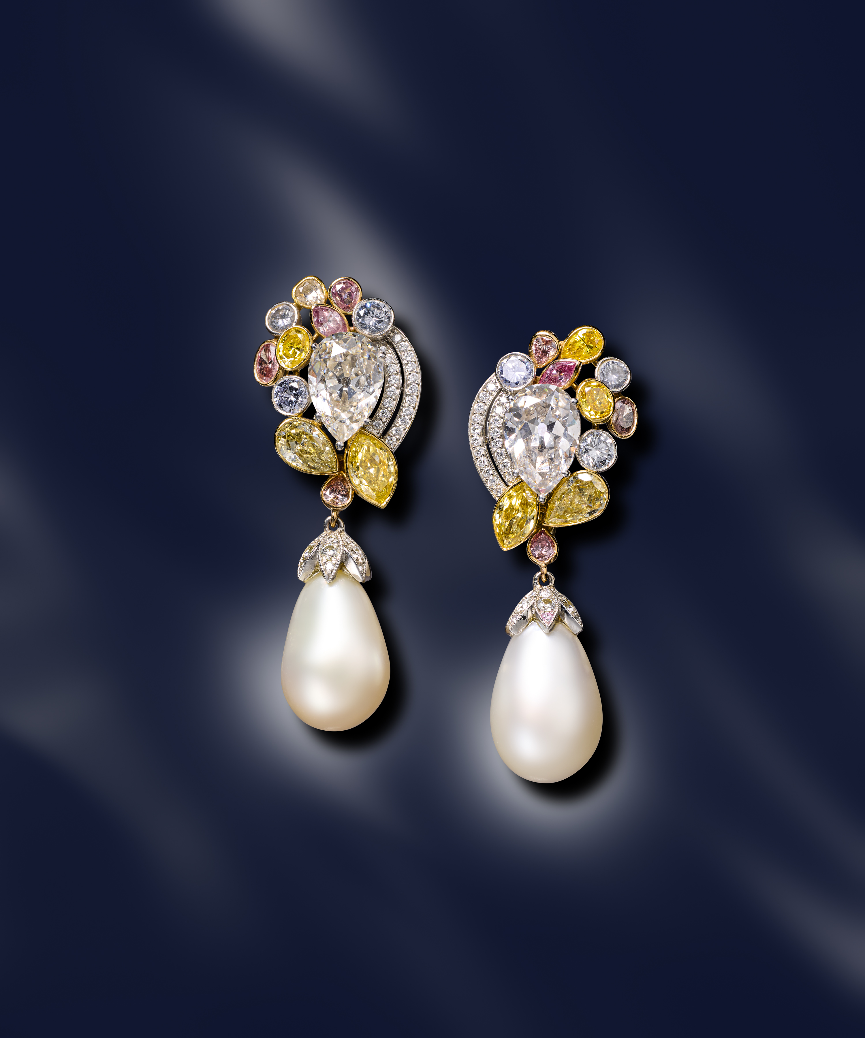 A pair of natural pearl and diamond drop earrings, set with pear-shaped diamonds weighing 2.51 and 2.59cts within a border of graduated fancy coloured and colourless diamonds in platinum and gold, each suspending a natural pearl drop, length 4.5cm