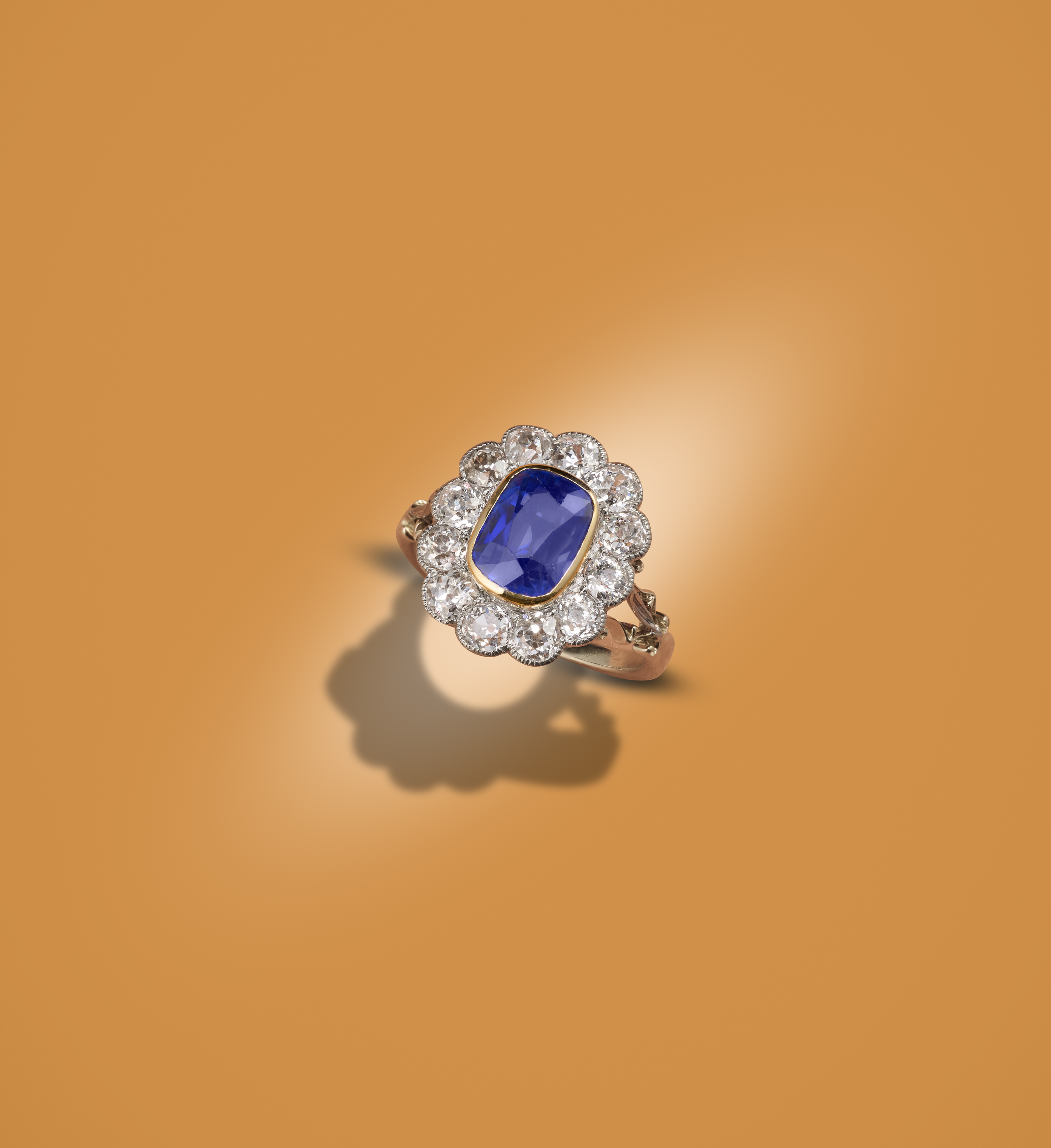 A sapphire and diamond cluster ring, the cushion-shaped sapphire weighing 3.53cts set within a surround of old cushion-shaped diamonds in platinum and gold, size N