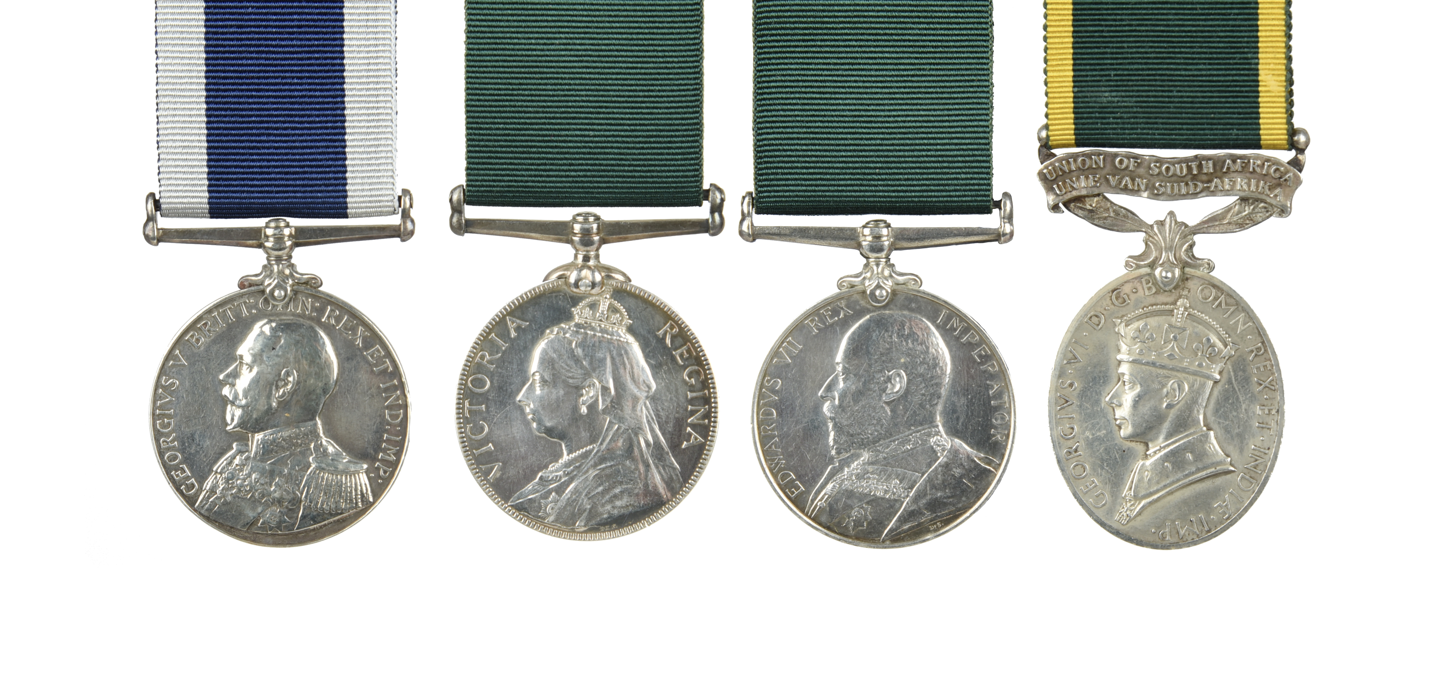 Long Service Medals (4): Royal Navy, George V, swivelling suspension, re-named in engraved capitals (305166W. NEWMAN. R.N.); Volunteer Force, Victoria Regina, unnamed; Volunteer Force, Edward VII Imperator (1886 CPL. J. LLOYD. 1/V.B. S.W. BDRS.); Efficiency Medal South Africa (T/SGT. H. MOFFATT S.A.M.C.); all about very fine or a little better. [4]