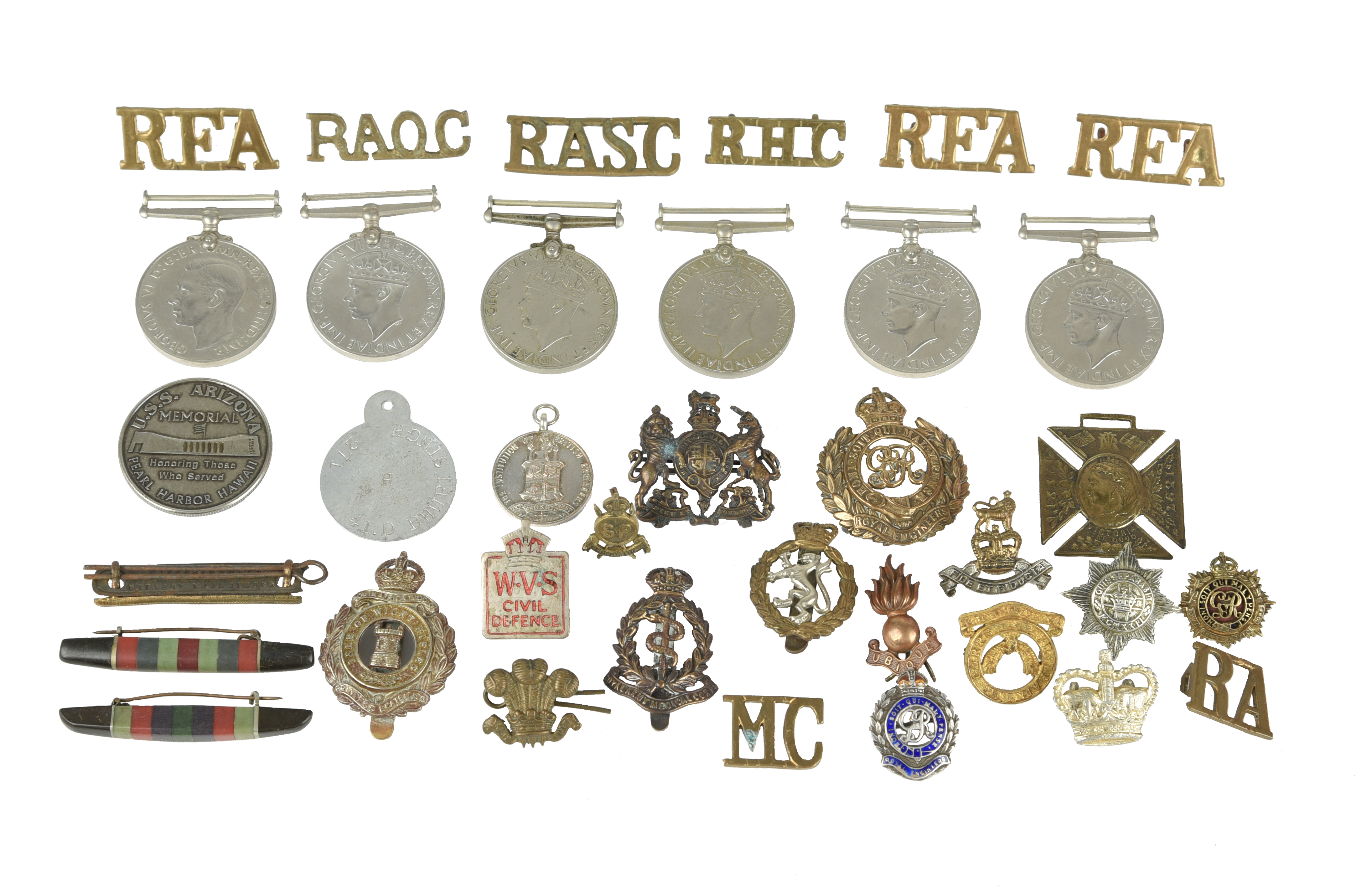 A small quantity of mainly British medals and insignia, including: 1939-45 War Medals (5), a Defence Medal, a W.V.S. Civil Defence lapel badge, a pair of RFA shoulder titles, various cap badges, and other items. [qty]