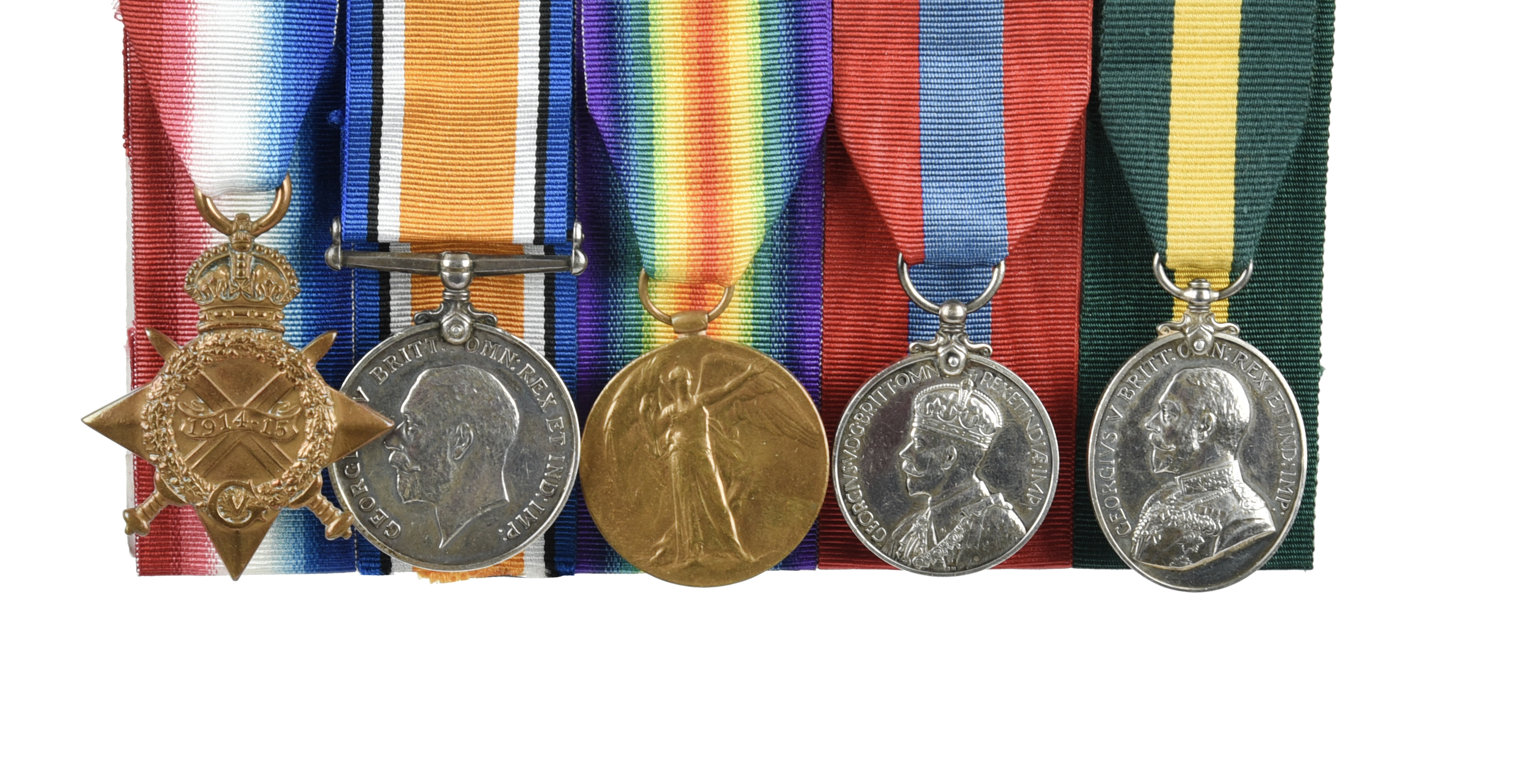 A part group of four medals to Warrant Officer 2nd Class Charles Tyler, 18th Battalion London Regiment: 1914-15 Star (54. SJT. C. TYLER. 18-LOND.R.); British War Medal 1914-20 (54 W.O. CL. 2 C. TYLER. 18-LOND. R.); Imperial Service Medal, George V (CHARLES TYLER.); Territorial Force Efficiency Medal, George V (590008 C.S. MJR C TYLER. 18/LOND:R.); later mounted for display with the addition of a replacement Victory Medal with original name erased. [4+1]