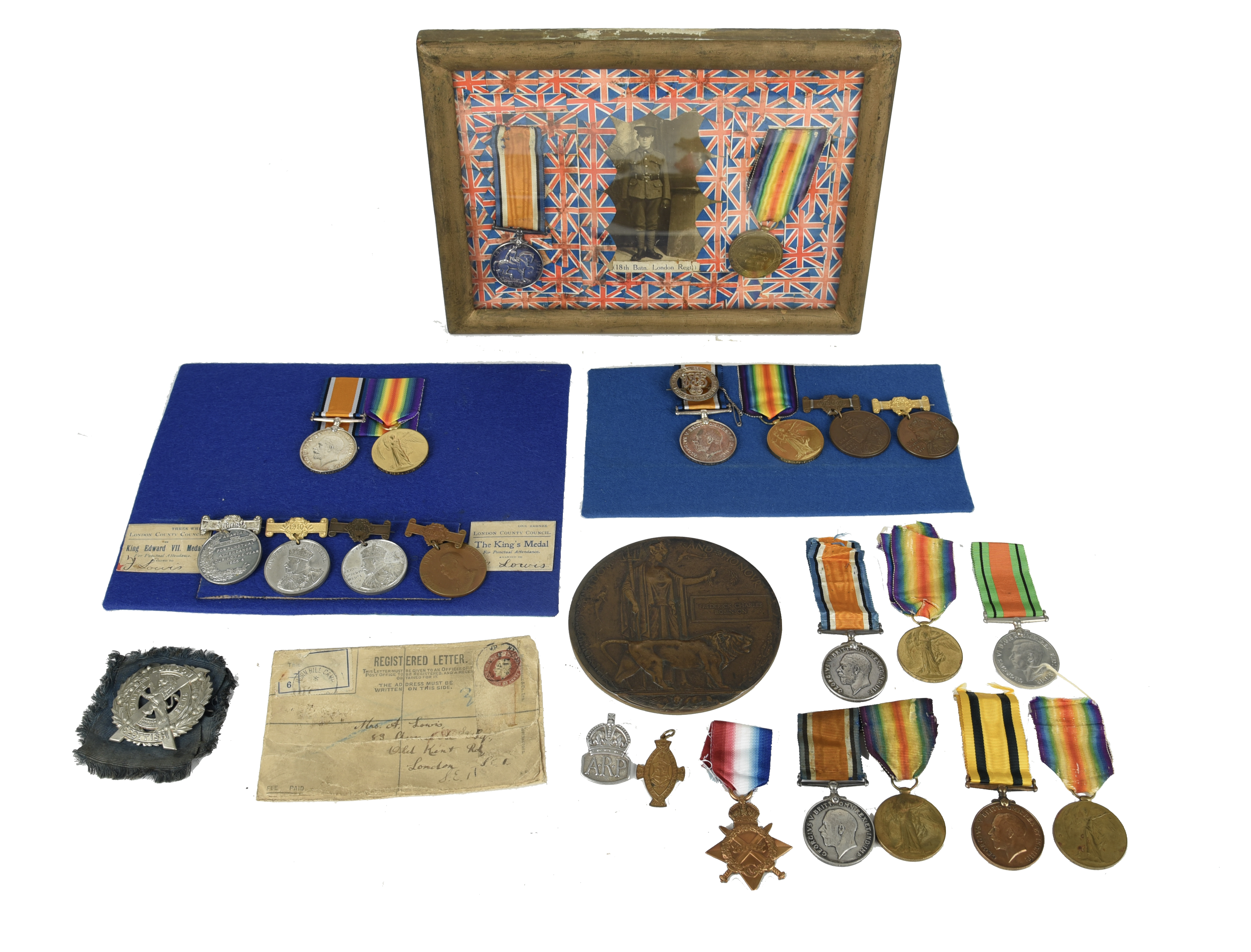 A collection of Great War Medal groups, comprising: 1914-15 Star (D.A. 1002, H. W. CASEY, D.H.R.N.R.); part group: BWM and Victory Medal with Silver War Badge and School attendance medals (1197 PTE. E. JACKSON. 18-LOND. R.); pair: BWM and Victory Medal (6475 HENRY S. C. REEVES 18-LOND.R.), framed with a photograph; four: BWM and Victory Medal (8220 PTE. D. MONTGOMERY 14-LOND.R), Defence Medal, attributed, unnamed as issued, Elizabeth II ISM in case of issue (DAVID MONTGOMERY), an ARP badge, and a London Scottish headdress badge; pair: BWM and Victory Medal (CPL. F. W. WITHERS. S.A.S.C.); part group: Victory Medal (1565 CPL. G. LEADER. 18-LOND.R.), Territorial Force War Medal (1565 PTE. G. LEADER. 18-LOND.R.); pair: BWM and Victory Medal with postal envelopes and school attendance medals (594512 PTE. F. A. LOWIS. 18-LOND.R.); together with a Memorial Plaque issued in commemoration of Frederick Charles Robinson, 18th Battalion London Regiment, who was killed in action in Egypt, 23rd December 1917 (FREDERICK CHARLES ROBINSON); offered with some research. [qty]