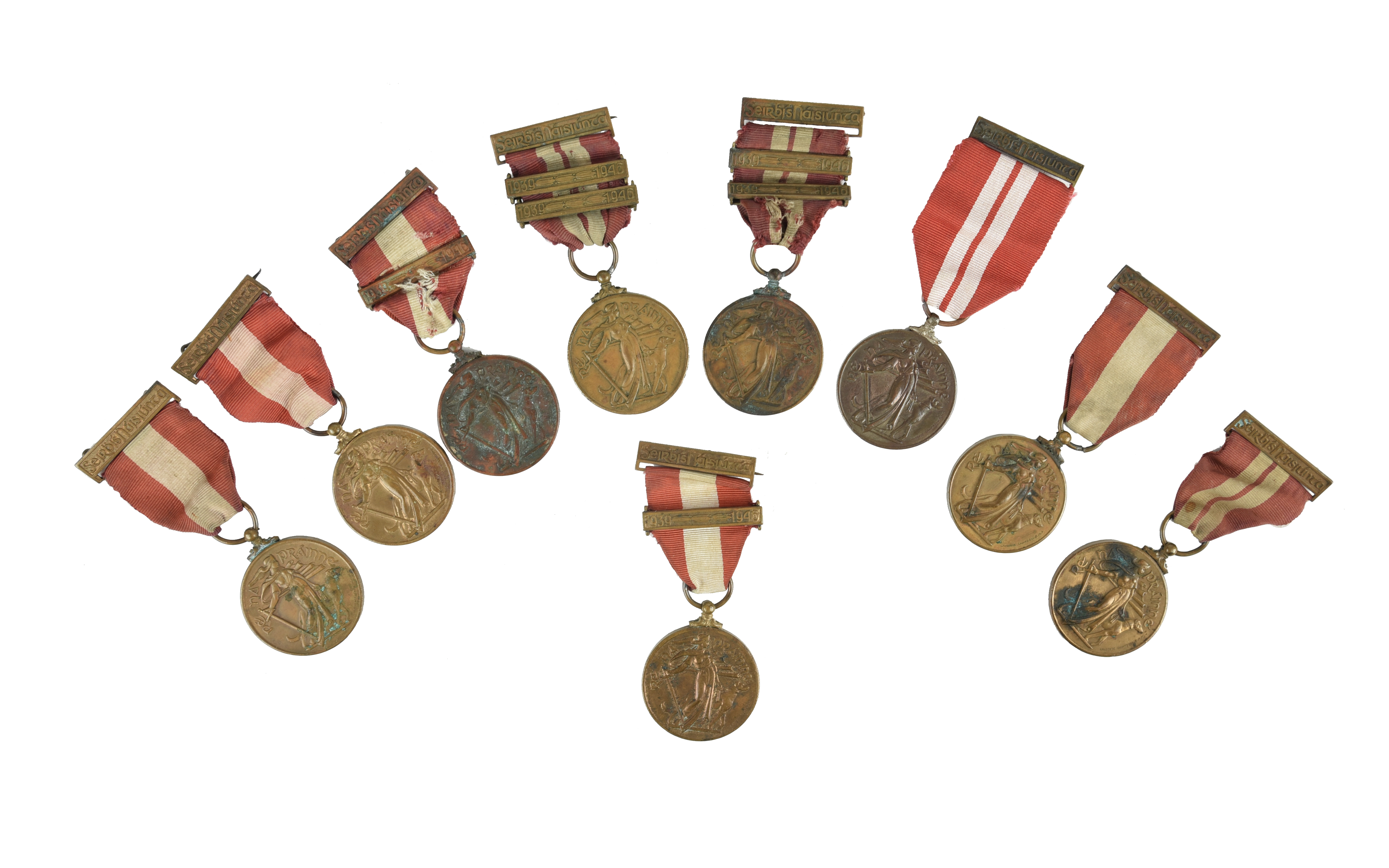 Ireland - Free State: a collection of Emergency Service Medals 1939-46, comprising: Army/Air Corps/Navy issue (2), each with two clasps; Local Defence Force Issue (4); Volunteer Aid (Red Cross) issue; and Local Security Force Issue (2), each with one clasp; all with ribbons and top brooches, fine to very fine, much wear to ribbons. [9]