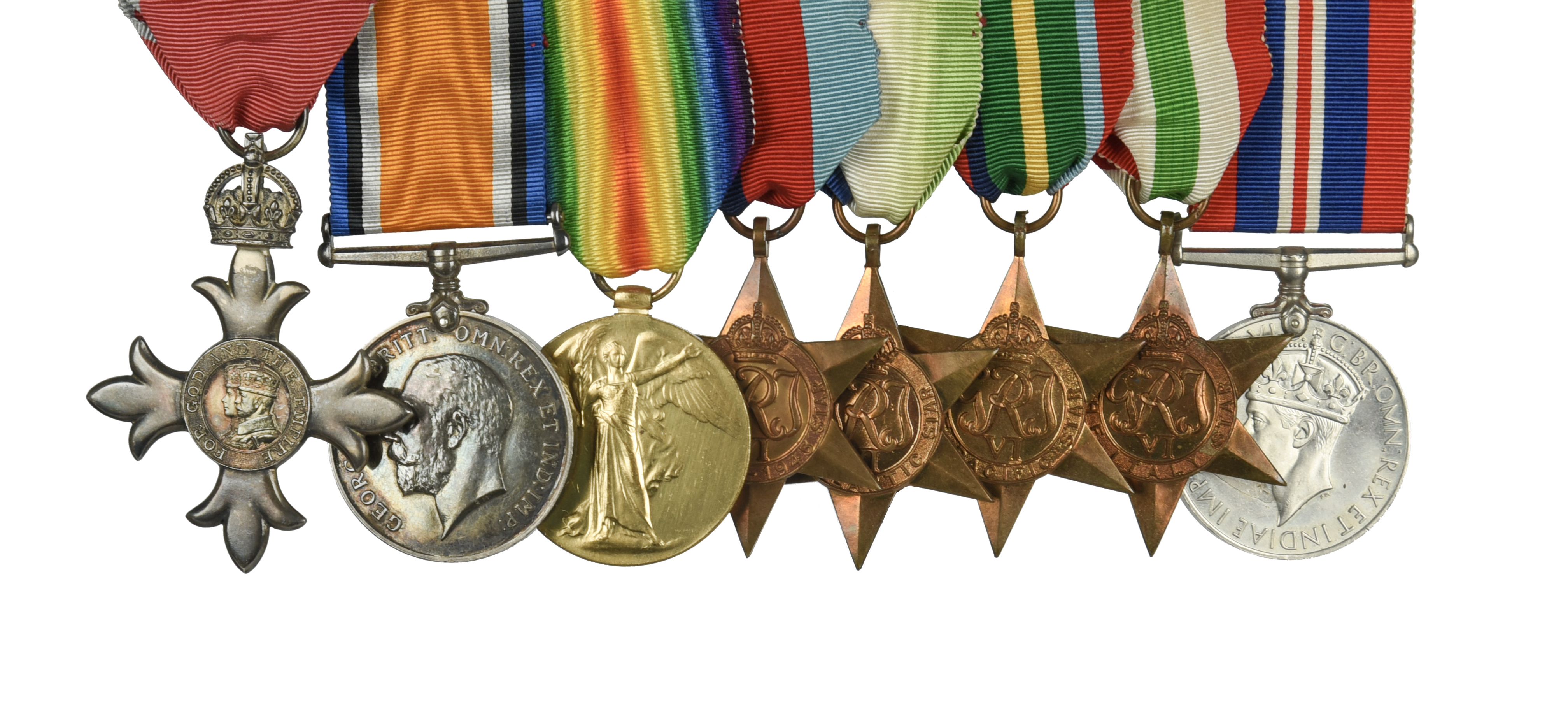 The Second World War lifeboat M.B.E. group of eight medals to Maurice John Case, Merchant Navy: The Most Excellent Order of the British Empire, civil division, member's breast badge (M.B.E.), second type; British War Medal 1914-20 and Victory Medal (MID. M. J. CASE. R.N.R.); 1939-45 Star, Atlantic Star, Pacific Star, Italy Star, War Medal 1939-45; mounted for wearing, good very fine, [8]; together with a manuscript report by the recipient of the sinking of S.S. Rhexenor on the 2rd February 1943; a book: Captain S.W. Rosskill, R.N., 'A Merchant Fleet in War 1939:1945'; a presentation silver-plated salver, 'PRESENTED TO CAPTAIN M. J. CASE. "HELENUS", FROM HIS FRIENDS AT GILCHRIST WATT AND SANDERSON PTY LTD SYDNEY 1960'; a cased pair of binoculars with this officer's name inside the lid; and a framed photograph of S.S. Helenus.