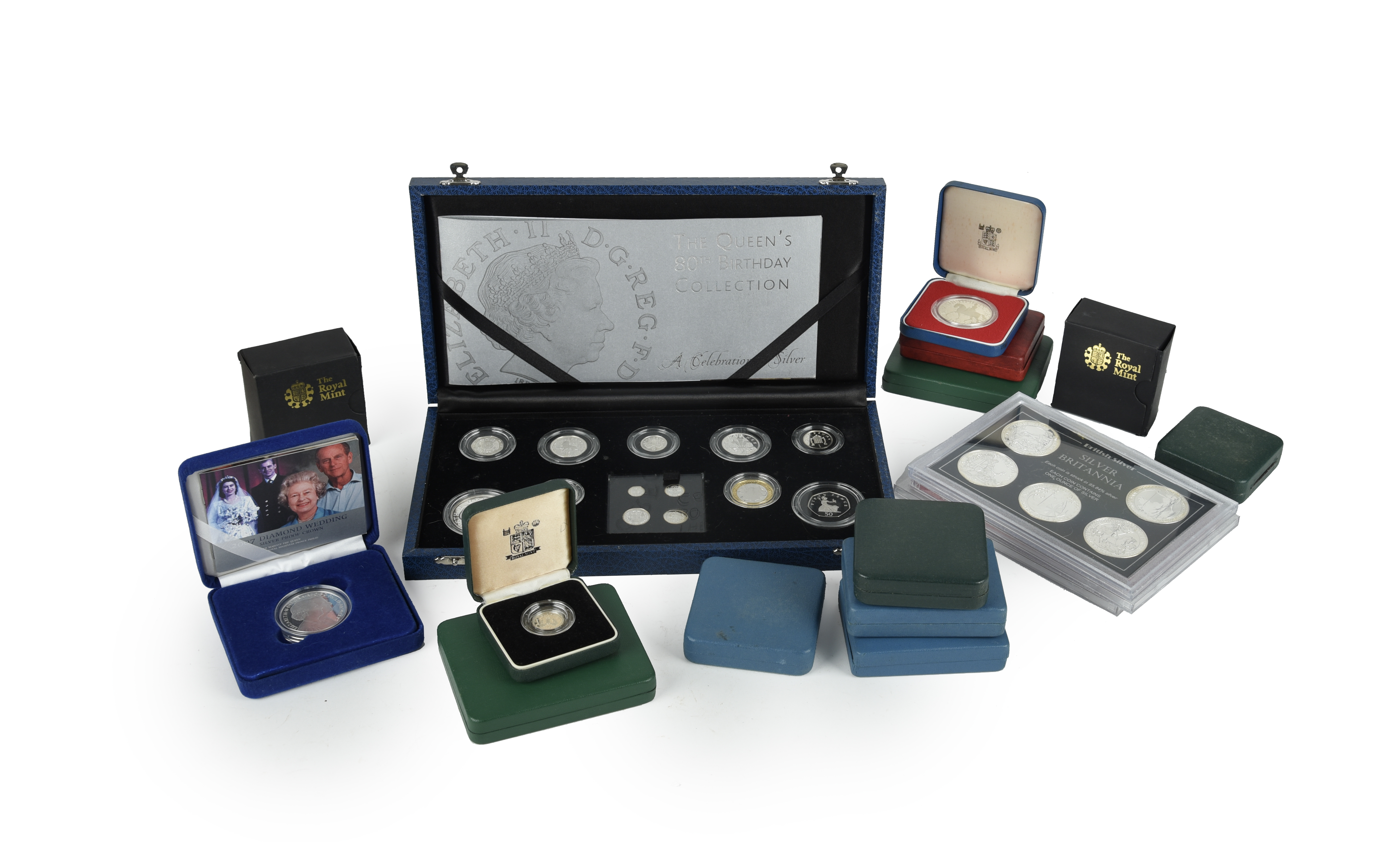 Elizabeth II, a quantity of silver proof coins in sets and as singles, including: The Queen's 80th Birthday Collection, 2006, thirteen coins, five pounds to penny including maundy set, cased with certificate; United Kingdon Silver Anniversary Collection, 1996, seven coins, pound to penny, cased with certificate and outer card box; Family Silver Proof Collection, 1995, three coins, two pounds (2) and pound, cased with certificate and outer card box; Diamond Wedding silver crown, 2007, cased with certificate and card slip; thirteen Britannia silver crown sized coins, in secondary retail packs with promotional inserts; eighteen other Royal Mint silver proof coins, cased singly or in pairs, some piedfort; and three other proof coins in capsules. [qty]