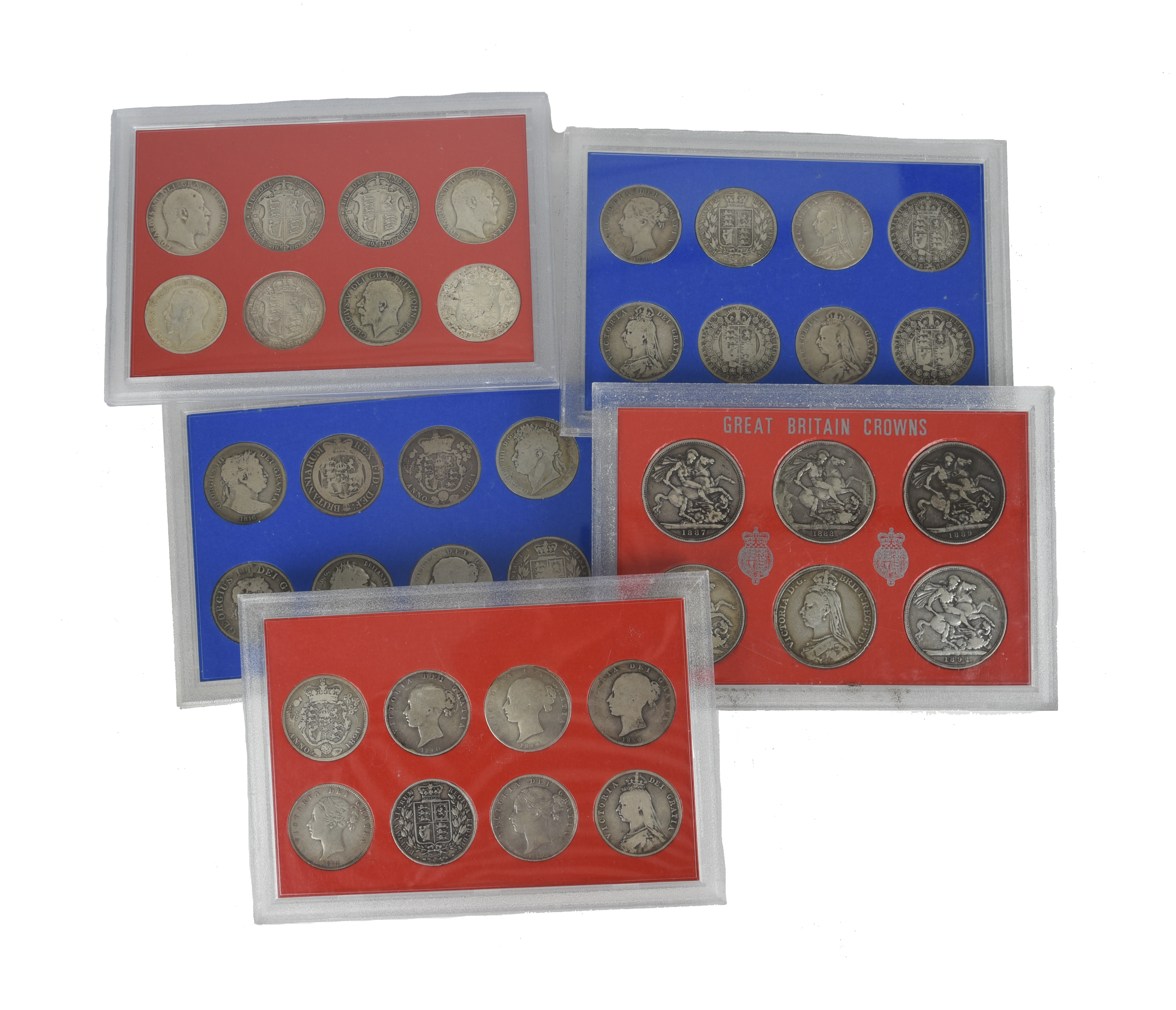 Victoria, silver crowns (6), 1887, 1888, 1889, 1890, 1891, 1892, Jubilee coinage (S 3921), about fine; together with silver half crowns (32), various reigns and date, George III - George V, in low grades, particularly the earlier issues; all in perspex collector's packs [38]