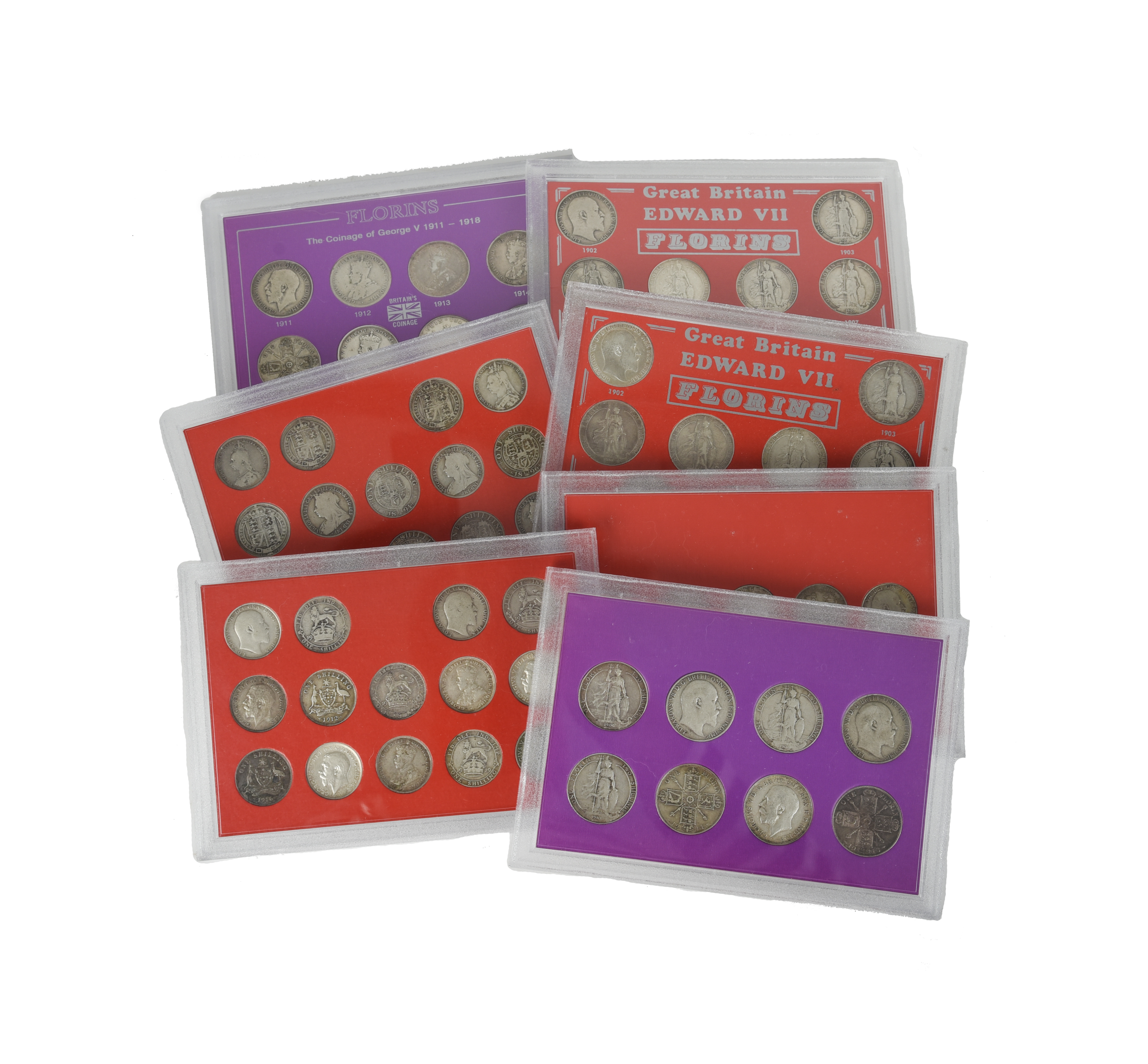 Victoria to George V, a collection of silver florins (34) and shillings (38), various issues and dates, circulated coins presented in modern perspex retail packs, some with promotional inserts, fine to near very fine. [72]