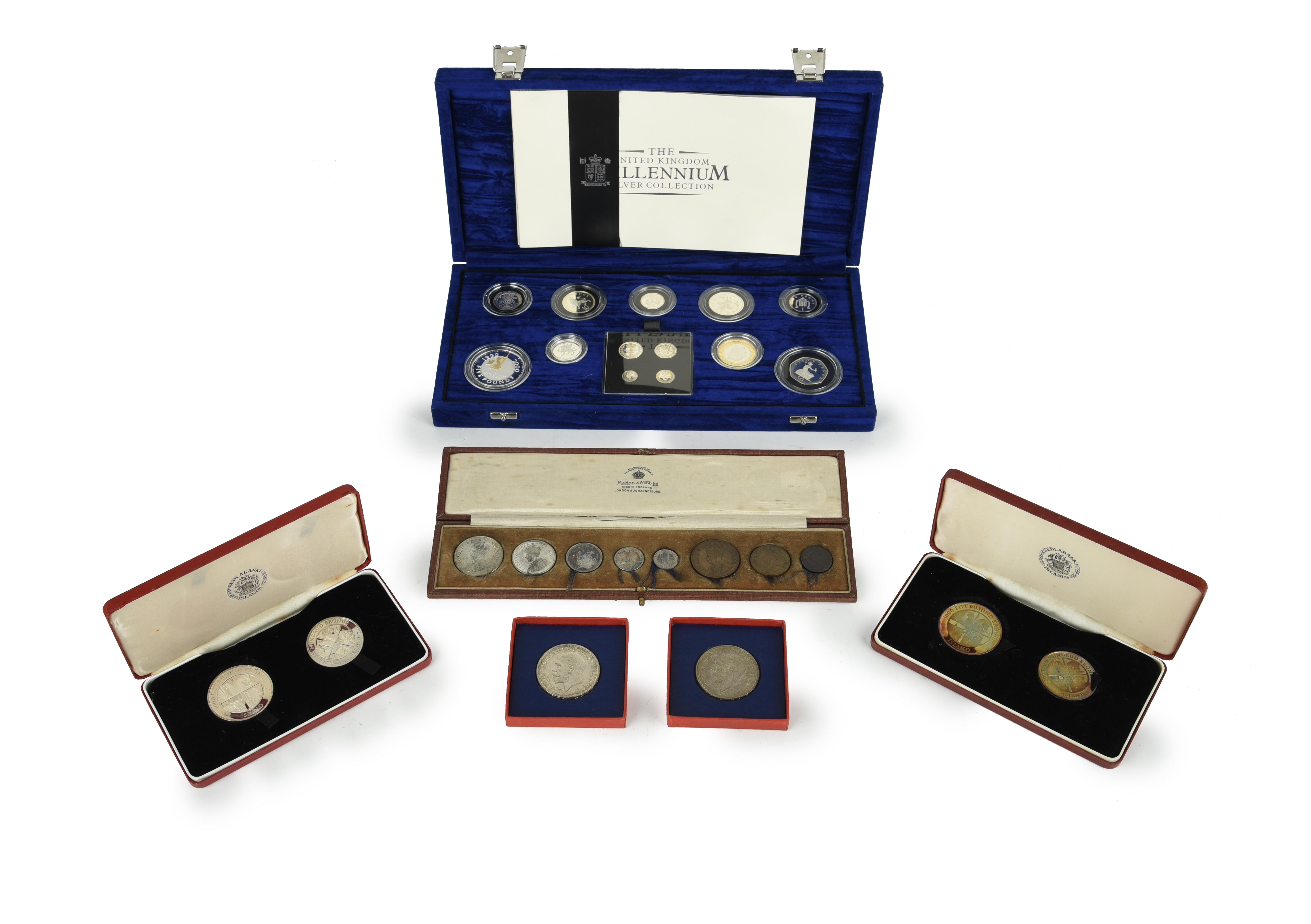 A small collection of proof sets and specimen coins, comprising: Great Britain, Elizabeth II, Millenium Silver Collection, 2000, thirteen silver coins, five pounds to penny including maundy set, cased with certificate and outer card box (PSS08), light toning to edges of fifty pence, otherwise about as struck; George V, crowns, 1935 (2), specimens in card boxes (S 4049), extremely fine; South Africa, George V, First Coinage of South African Mint Pretoria 1923, eight coins, half crown to penny, in Mappin & Webb case of issue, extremely fine; and two Icelandic silver two coin cased sets commemorating the 1,100th anniversary of the settlement of Iceland, 1974, each 1,000 and 500 kronur, one set with a certificate, good extremely fine or better, one set toned.