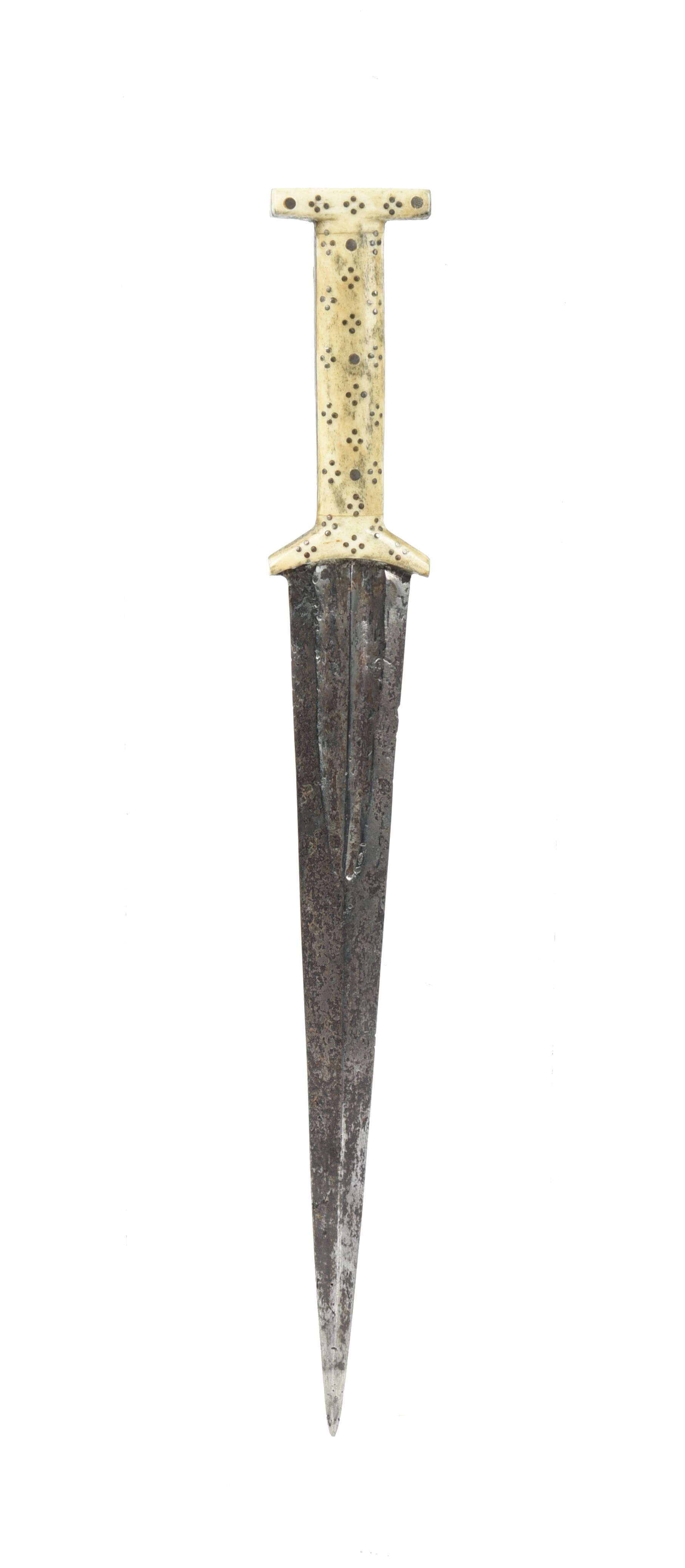 A Swiss or German dagger (baselard), 15th century and later, triangular blade 9.5 in. with shallow medial ridge and broad converging fullers at the forte, I-shaped hilt with replacement bone grips fixed with rivets and with a repeated quatrefoil pattern of inlaid pellets.