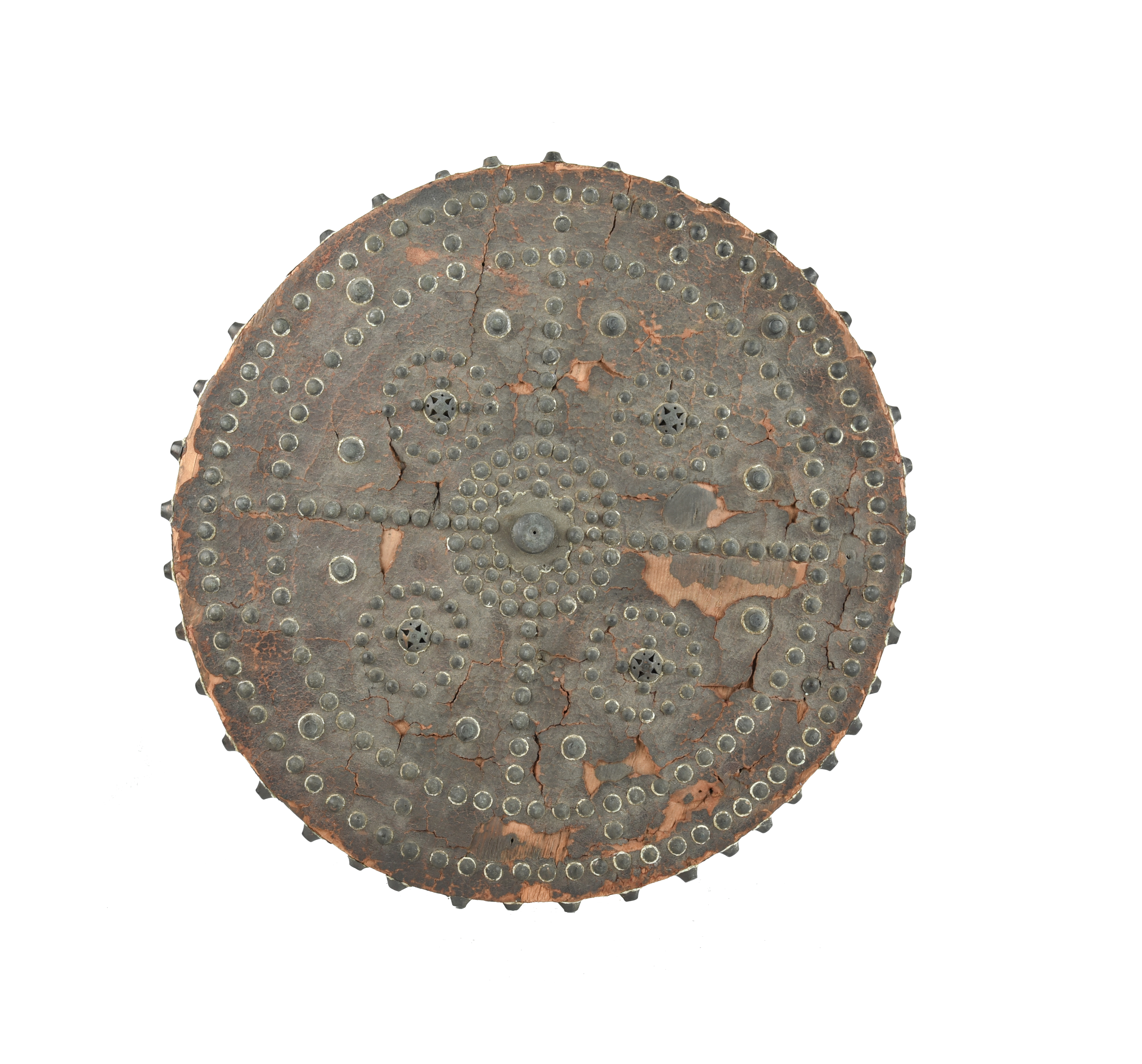 An 18th Century Scottish shield (targe), circular form and of wood faced with leather and stud-work and backed with fabric, the domed studs arranged around a central boss in three concentric circles with four radiating lines and two further concentric circles forming a border, the angles between the radiating lines occupied with further domed and conical studs arranged around openwork bosses, the rim set with conical studs, the back with later suspension loops for display and four later leather sleeves (presumably for mounting crossed swords), 46 cm (18 in.)