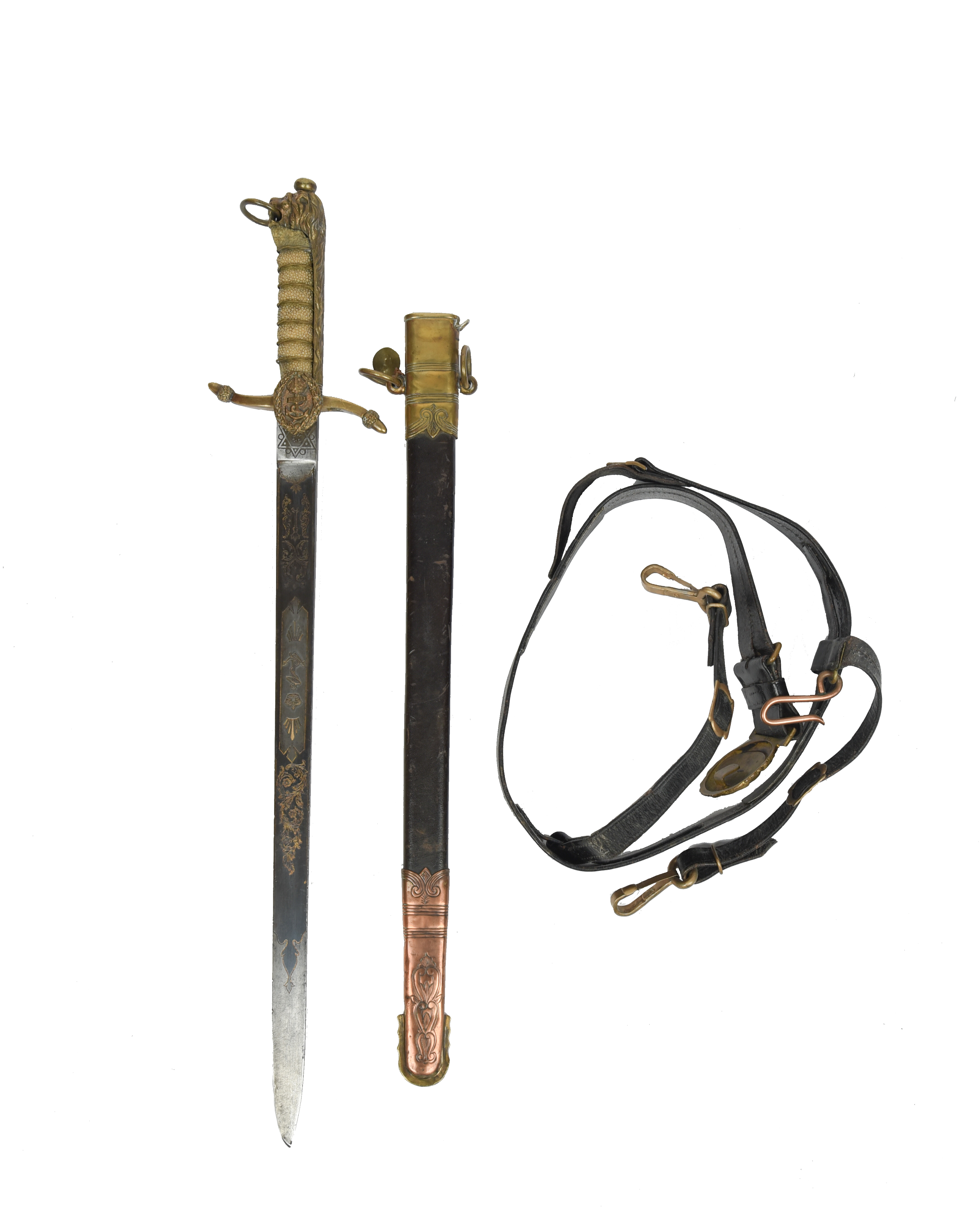 A Royal Naval midshipman's dirk, George V, partly blued blade, gilt brass hilt with lion-head pommel, brass mounted leather scabbard; together with a Royal Naval sword belt.