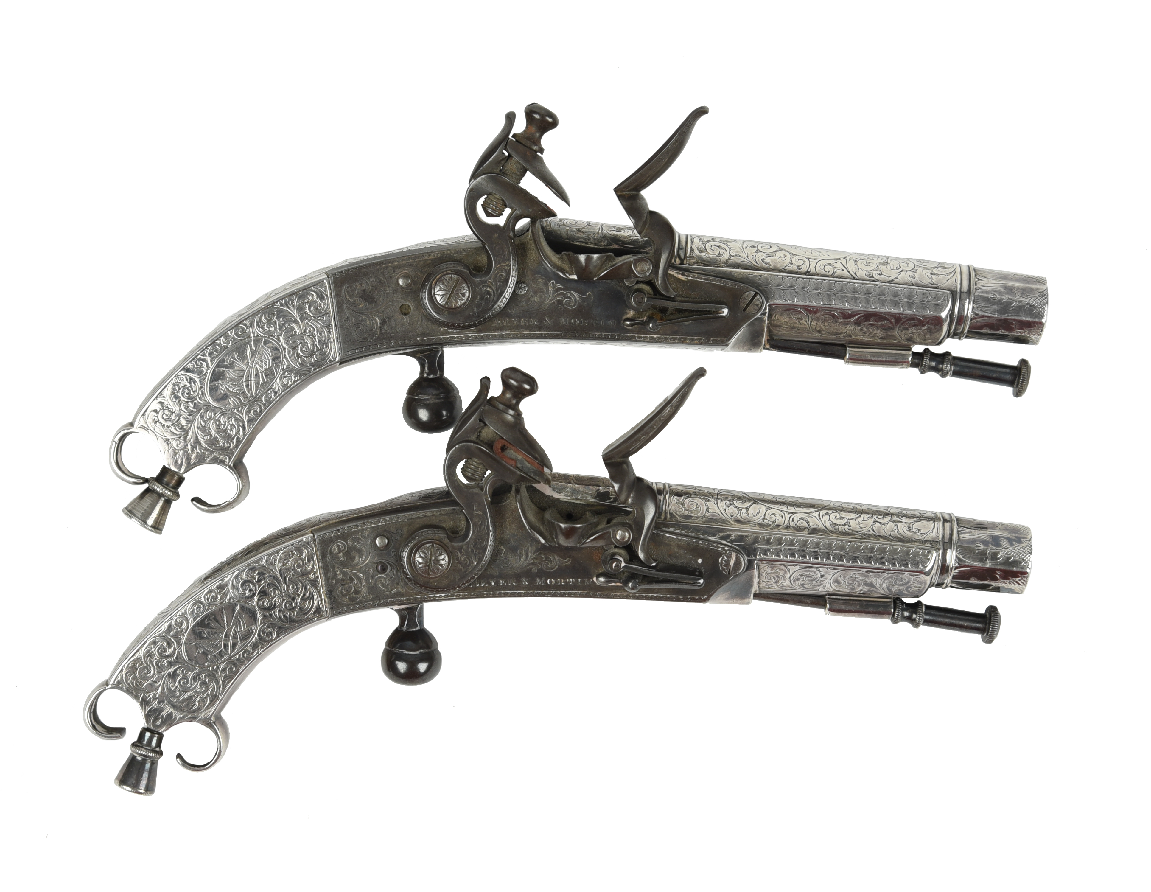 A pair of very fine Scottish all-metal flintlock pocket pistols retailed by Meyer & Mortimer, 116 bore 4 in. three-stage barrels of silver with ferrous cores, faceted at the breeches, round in the mid-stage and dodecagonal at the muzzle, chased all-over with scrolling acanthus and thistle details and with a thistle in an oval panel to the tops, Birmingham proof; steel locks with waterproof pans and roller bearing frizzen springs, engraved with scrolls and geometric borders and inscribed 'MEYER & MORTIMER'; silver stocks engraved en suite to the barrels and with thistles and trophies of arms in oval panels to the grips, butts with characteristic ram's horns terminals; steel belt hooks, screw-out prickers to the butts, ball triggers, steel ramrods; early 19th century. [2]