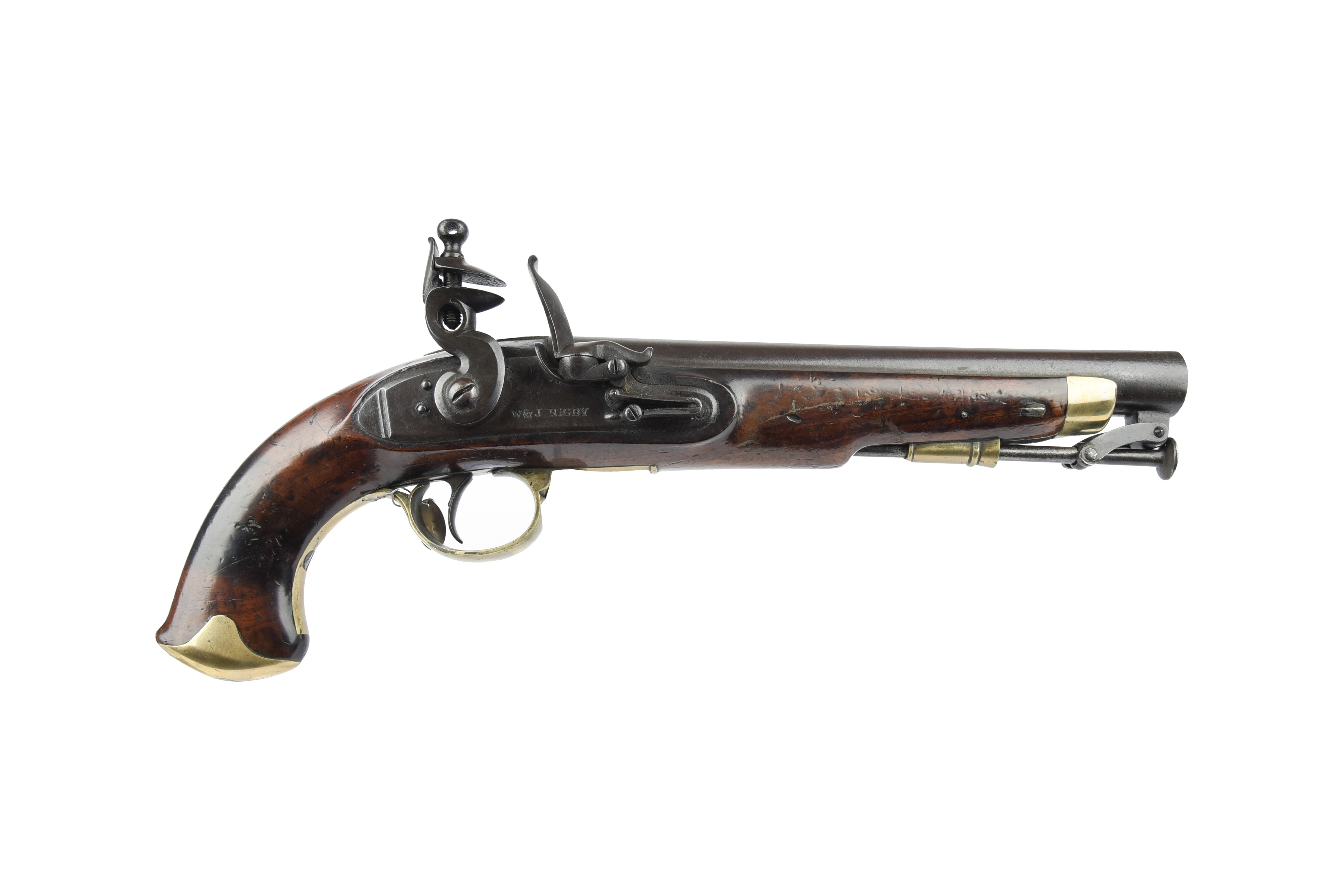 W & J Rigby: a scarce Irish 16 bore constabulary flintlock pistol, barrel 9 in., narrow top flat impressed 'DUBLIN' and with later registration mark 'WB 166' (possibly Waterford Borough), single crowned proof mark to the breech; flat lock plate with bevelled edges and stepped at the tail, impressed 'W & J RIGBY', roller frizzed spring bearing, waterproof double bridle pan, ring necked cock; full stock with brass furniture, narrow 'fishtail' grip. Section 58(2) - no licence required if possessed as a curiosity or ornament.