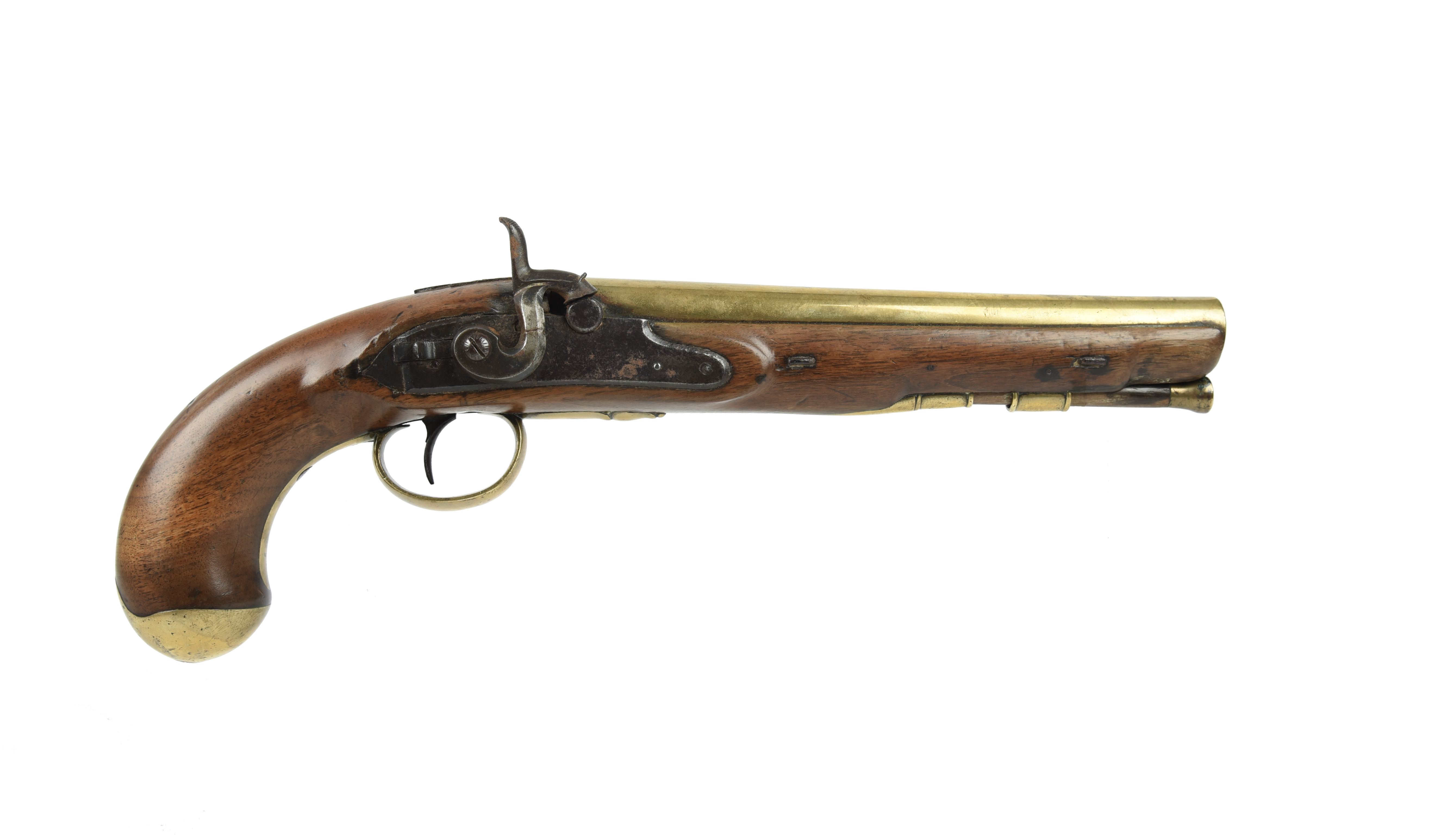An English 22 bore percussion conversion holster pistol, slightly swamped brass barrel 8.5 in., top engraved 'J HARDING BOROUGH LONDON L', London proof, drum-and-nipple conversion from flintlock, plain lock plate with stepped tail and safety bolt, walnut full stock with brass furniture, brass tipped wooden ramrod. Section 58(2) - no licence required if possessed as a curiosity or ornament.