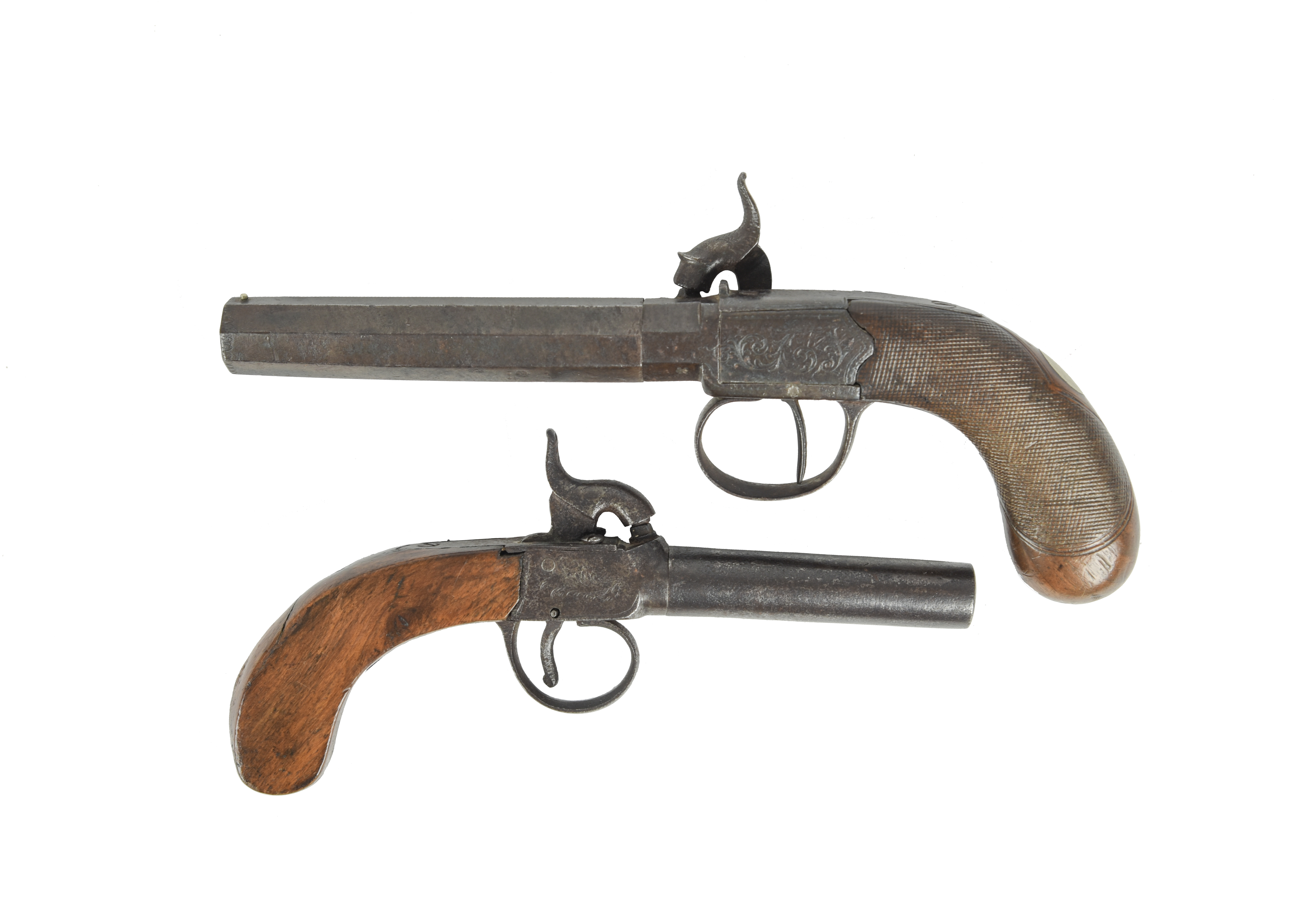 An English 70 bore percussion pocket pistol, hexagonal turn-off barrel 4.25 in., bead fore-sight, Birmingham proof, scroll engraved box lock with back sight, chequered walnut grip; together with another similar pistol, round barrel 3 in., figured flat-sided grip. [2] Section 58(2) - no licence required if possessed as a curiosity or ornament.