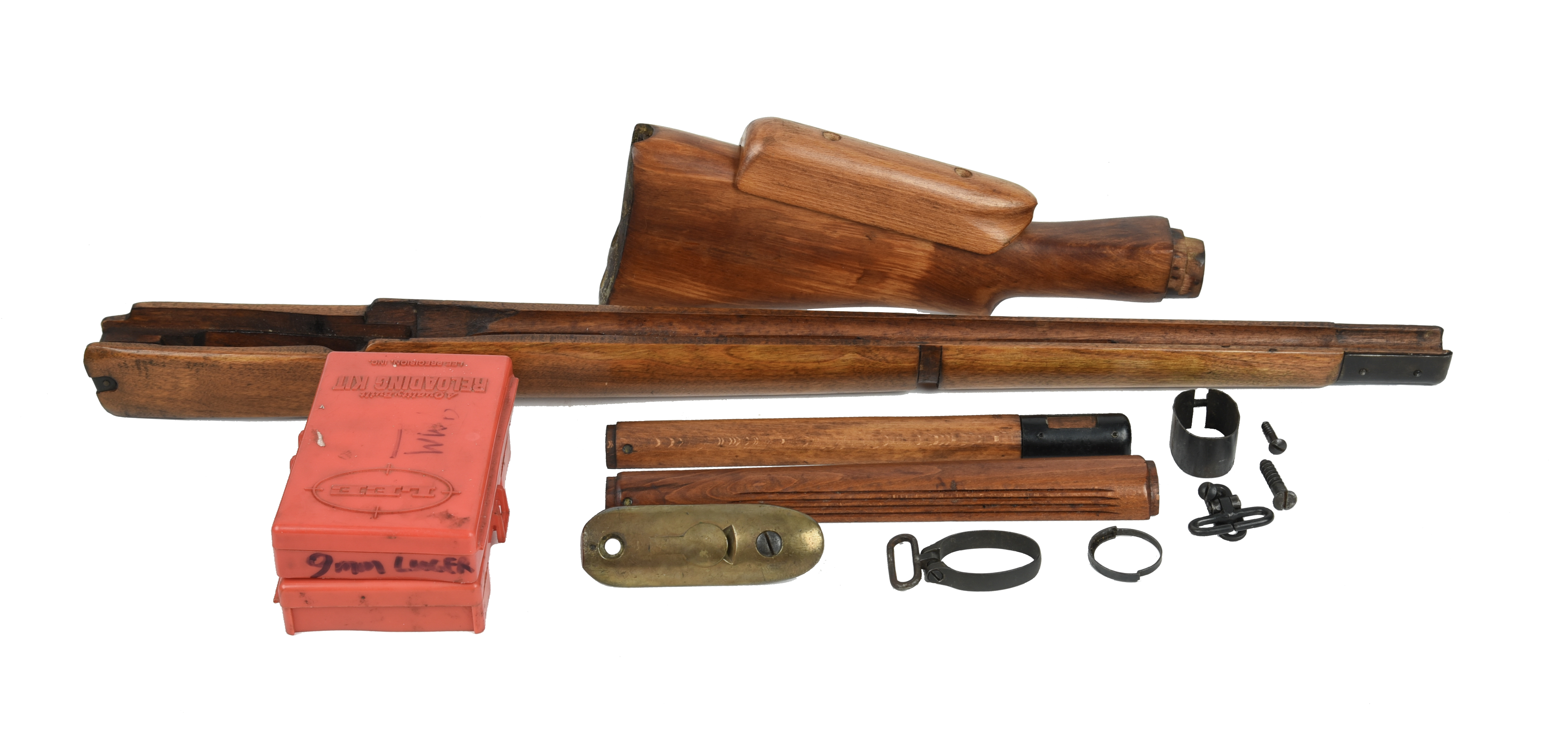 A rifle stock for a .303 Rifle No 4 and associated metal components, vis.: butt with later raised combe, fore-end, fluted rear handguard, front handguard, brass butt plate with screws, lower sling swivel and screws, lower band, swivel band and upper band; together with a Lee loading kit for .455 Webley, and another for 9x19mm Parabellum.