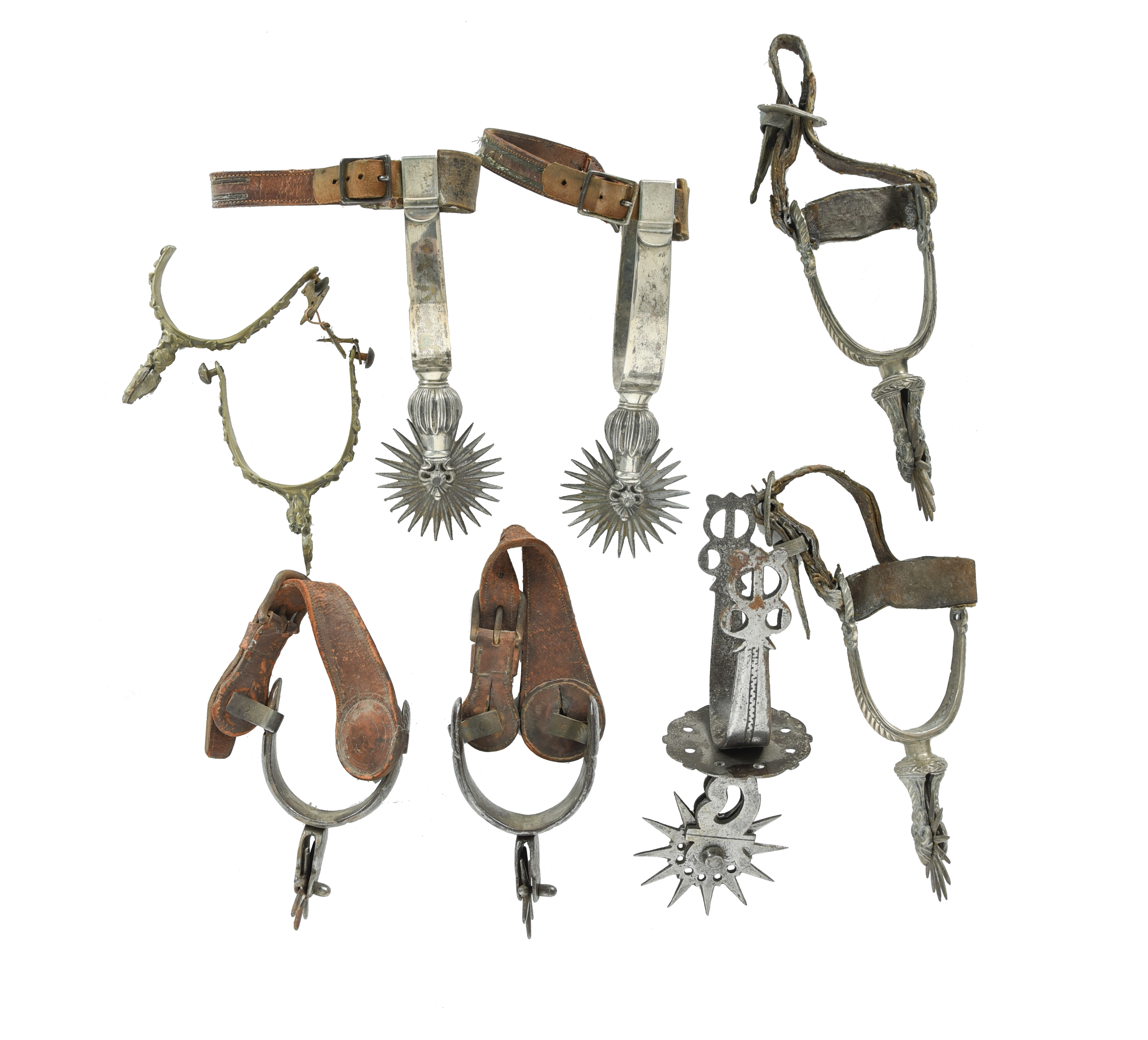 A collection of 19th century South or Central American rowel spurs, comprising: i) a pair, white metal, plain heel bands with leather straps, necks of fluted baluster form, large iron rowels with close-set spokes; ii) a pair, white metal, heel bands decorated with chevrons, leather straps, ornate necks, multi-spoke iron rowels; iii) a pair, all-steel, thick heel bands cut with diagonal lines, leather straps, flat necks, rowels each with eight short spokes; iv) a pair, gilt-metal, heel bands and necks with ornate foliate decoration in relief, necks terminating in boars' heads (one incomplete), small iron rowels with triangular spokes; v) a single steel spur, large pierced roundel between the heel band and the openwork decorated neck, large pierced rowel. [9]